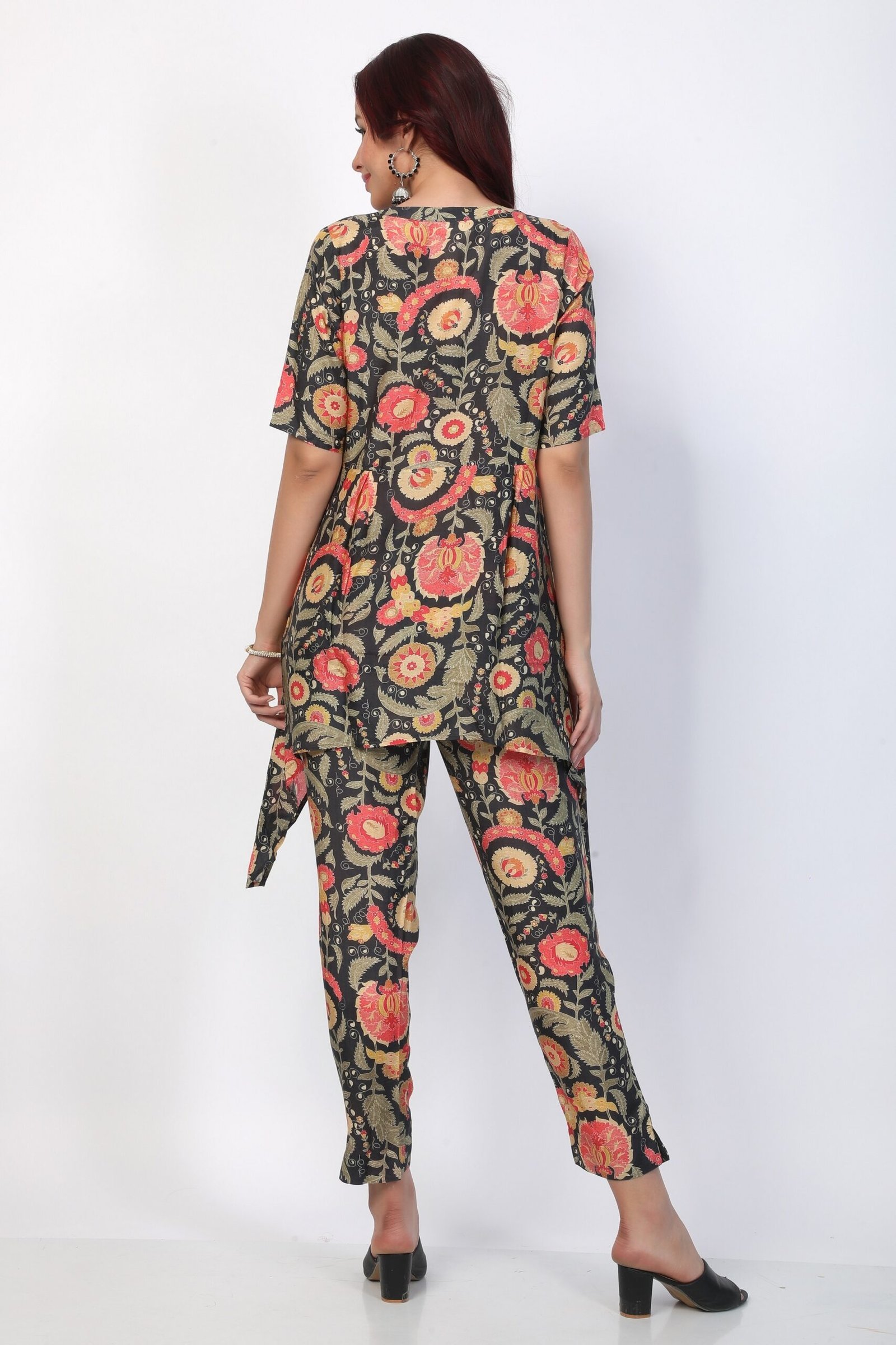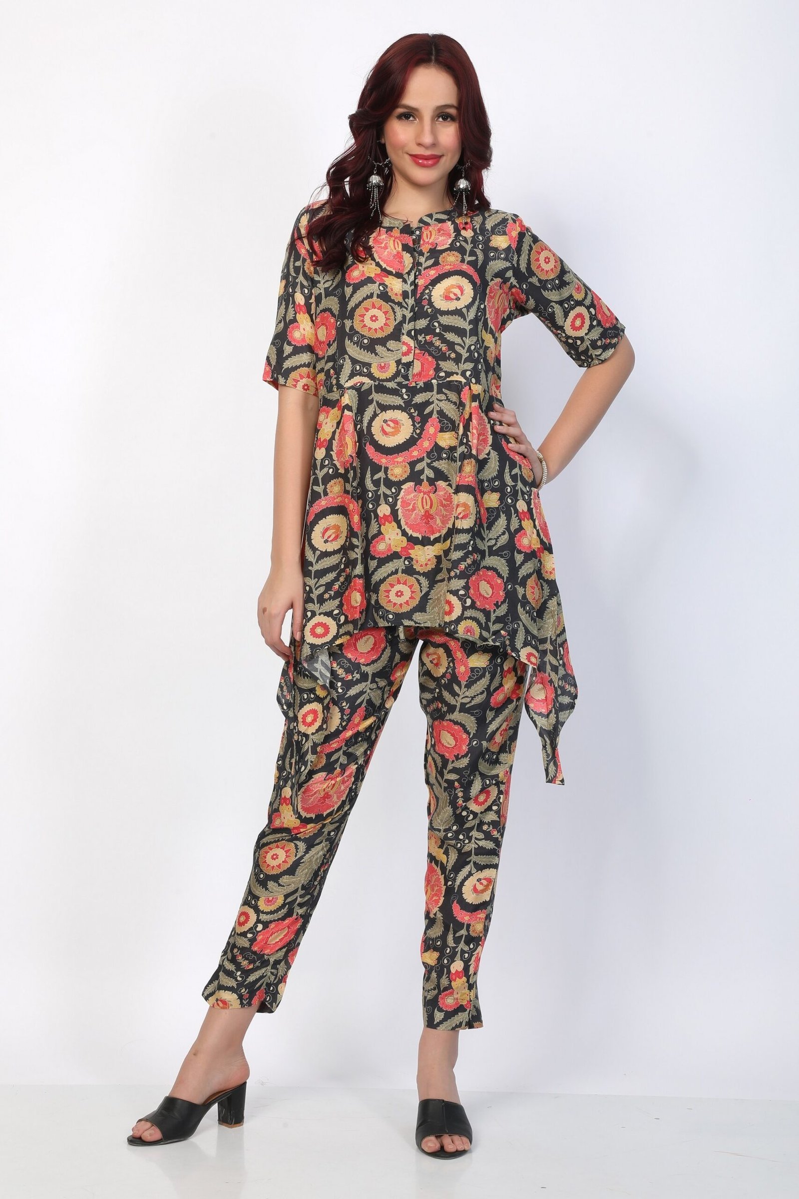 Black Floral Print Asymmetric Muslin Silk Co-ord Set