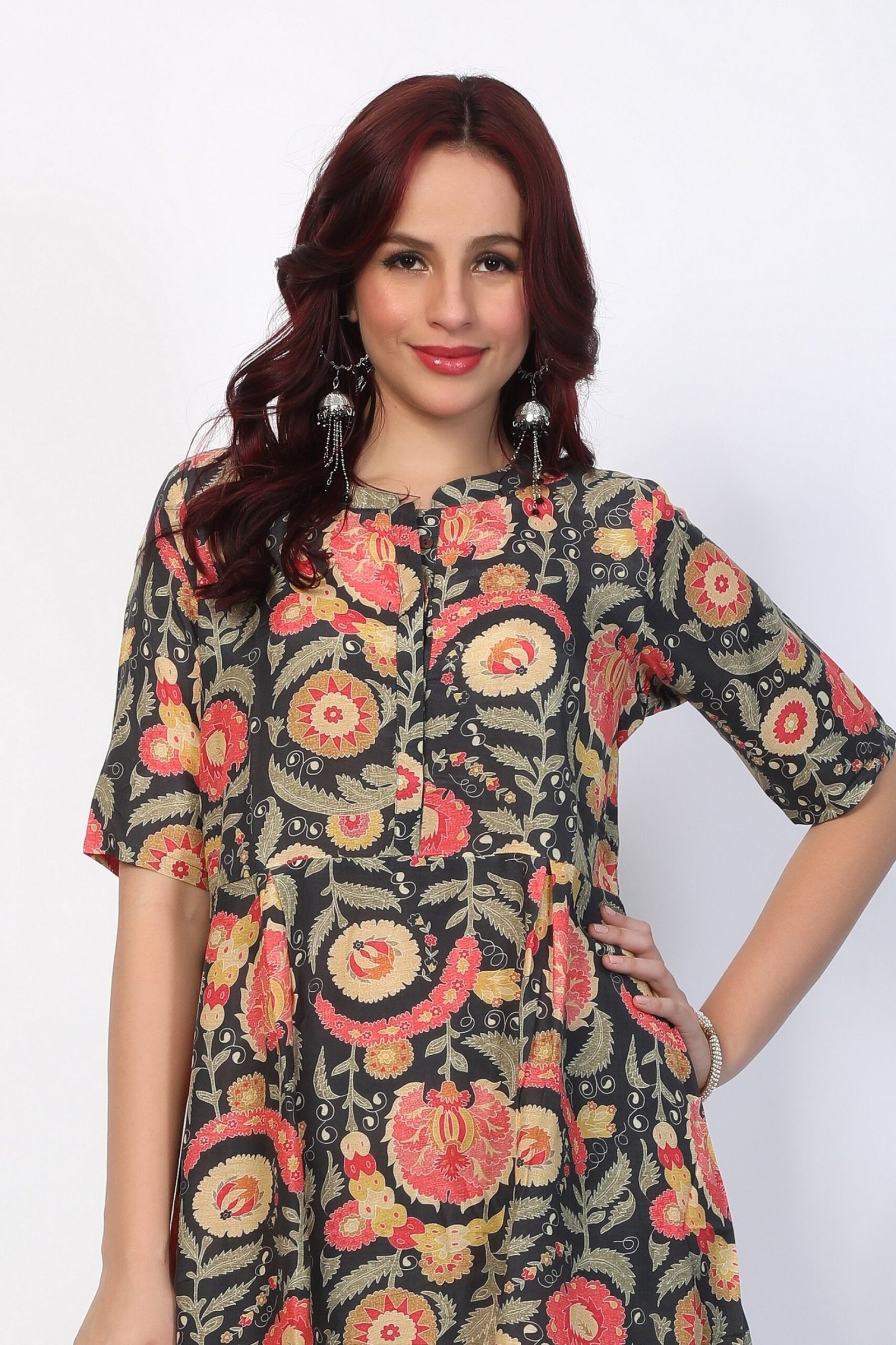 Step out in high fashion with this striking Black Co-ord Set. Crafted from premium Muslin Silk (100% Viscose), the fabric is lightweight and flowy, perfect for a comfortable yet stylish drape. The set features a trendy Asymmetric Tunic with a handkerchief hemline, adorned with bold Red & Beige Floral Motifs. Paired with Matching Printed Pants, this ensemble offers a modern, chic silhouette for casual or semi-formal occasions.