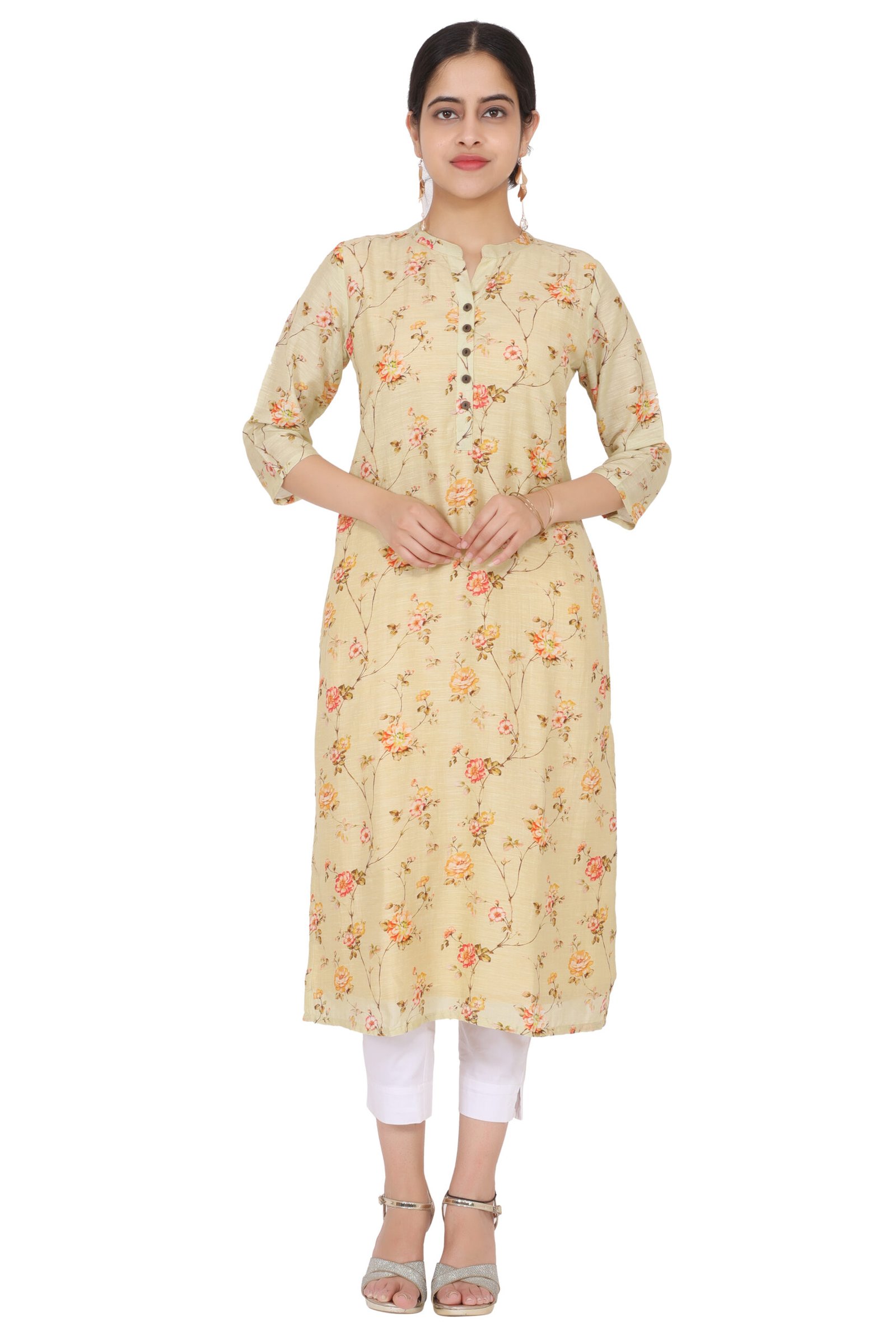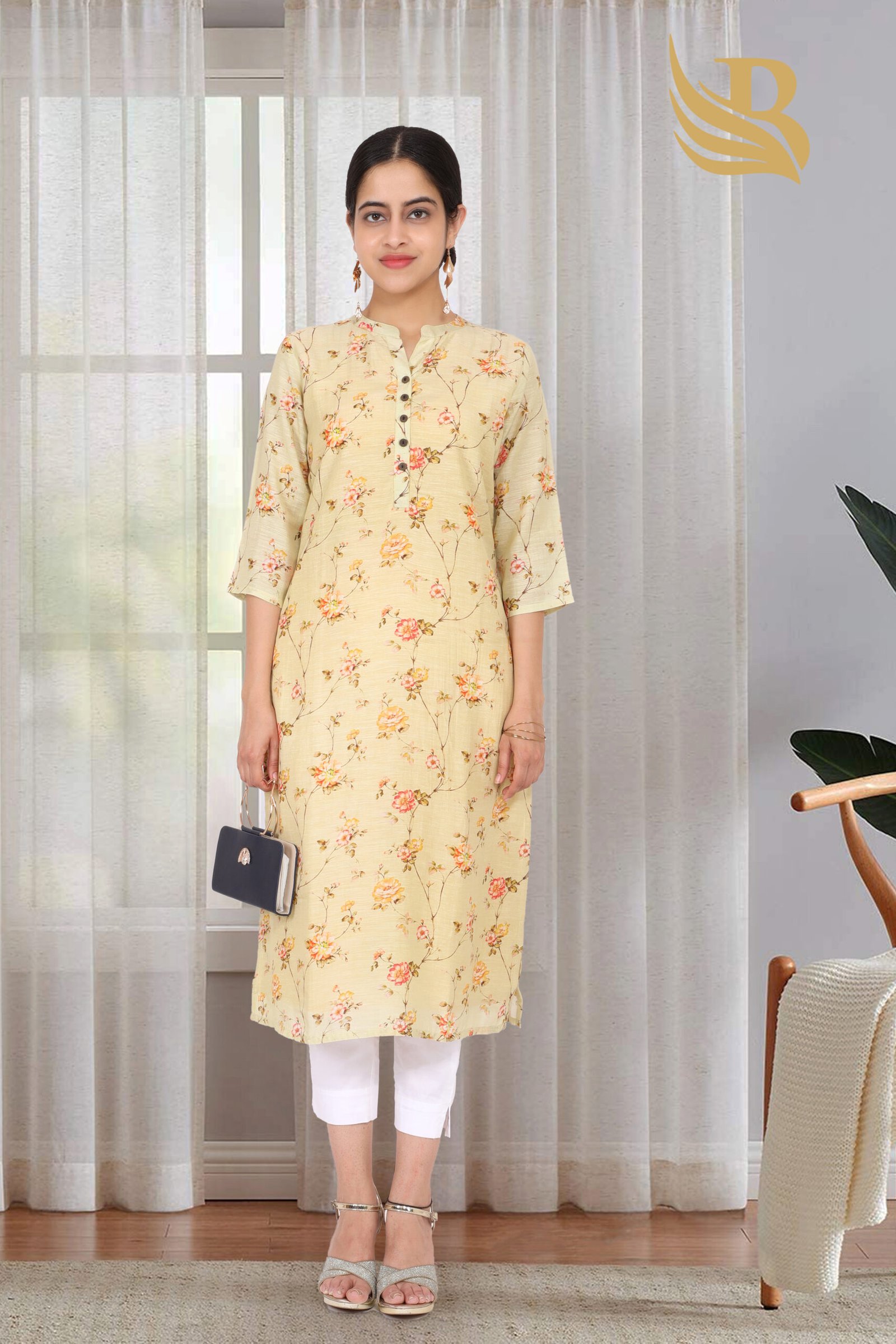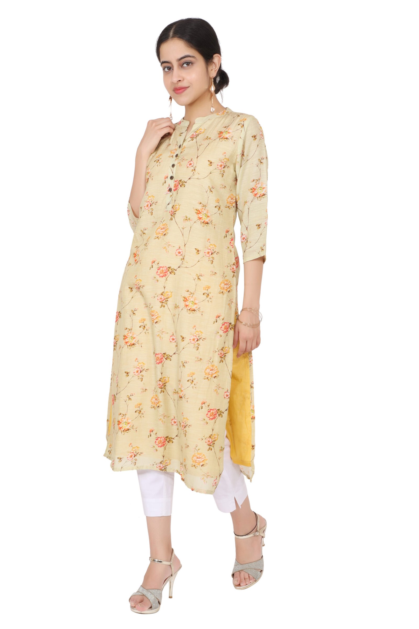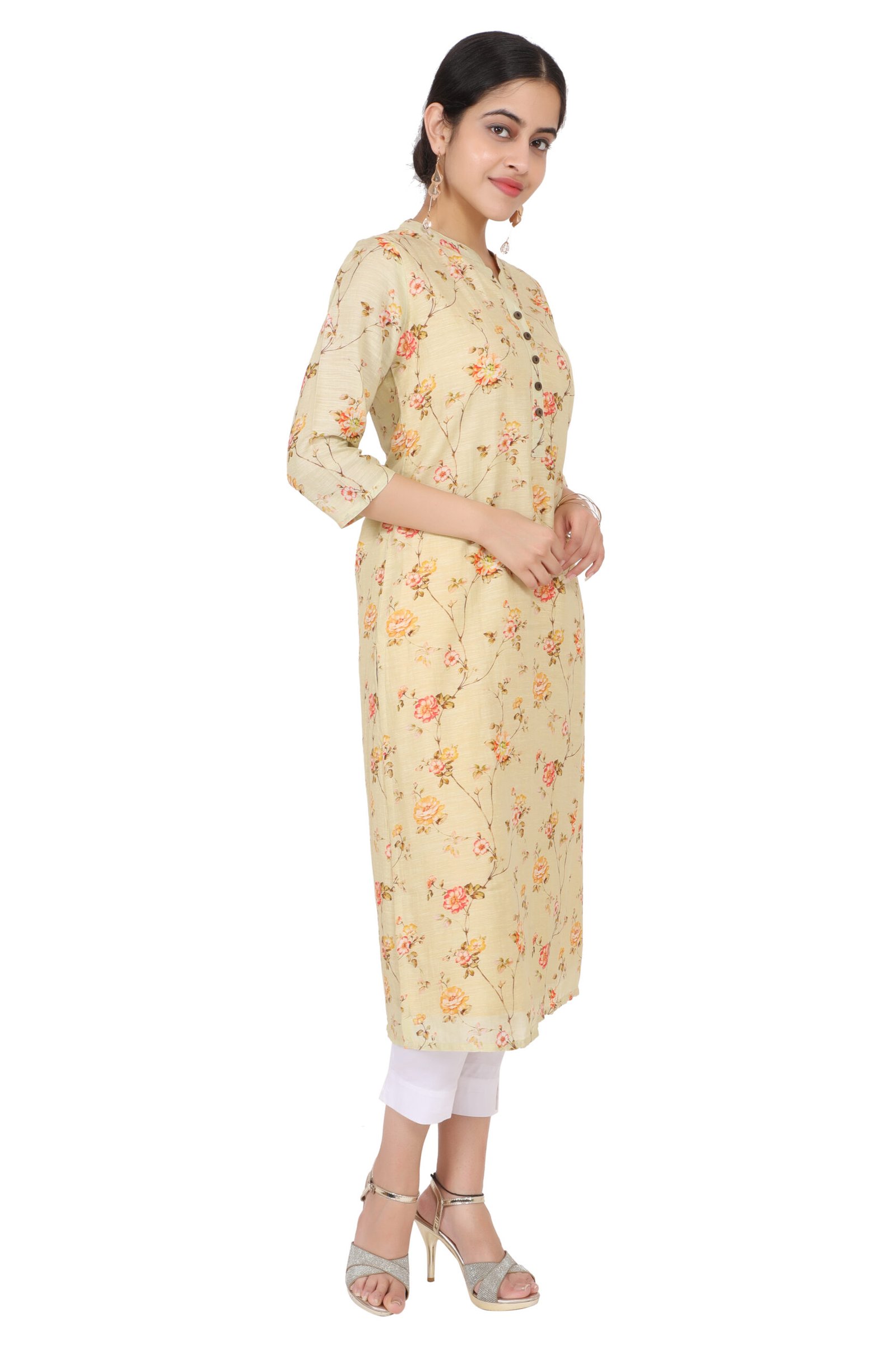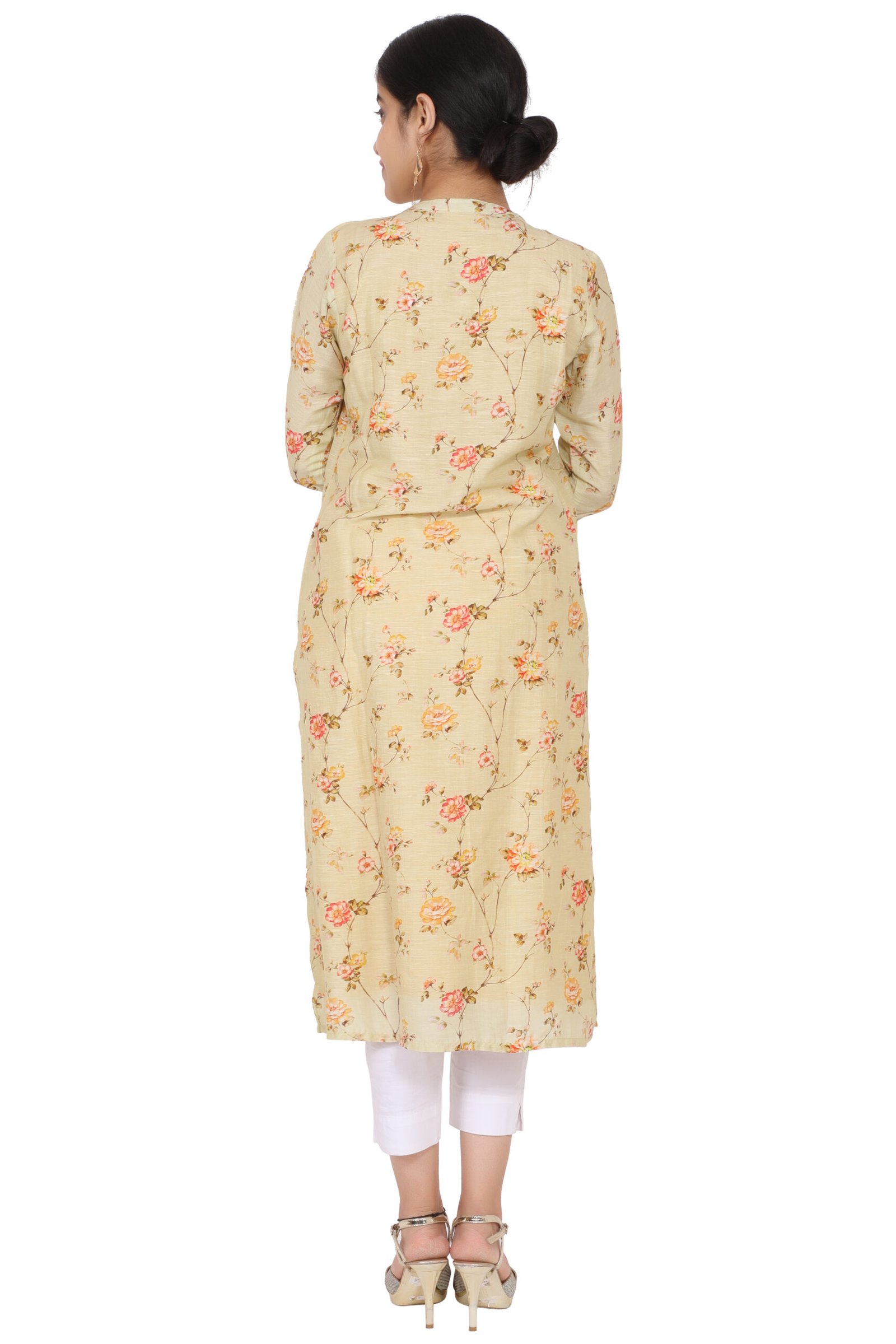 Color: Pale Yellow / Cream with Peach & Green Floral Print