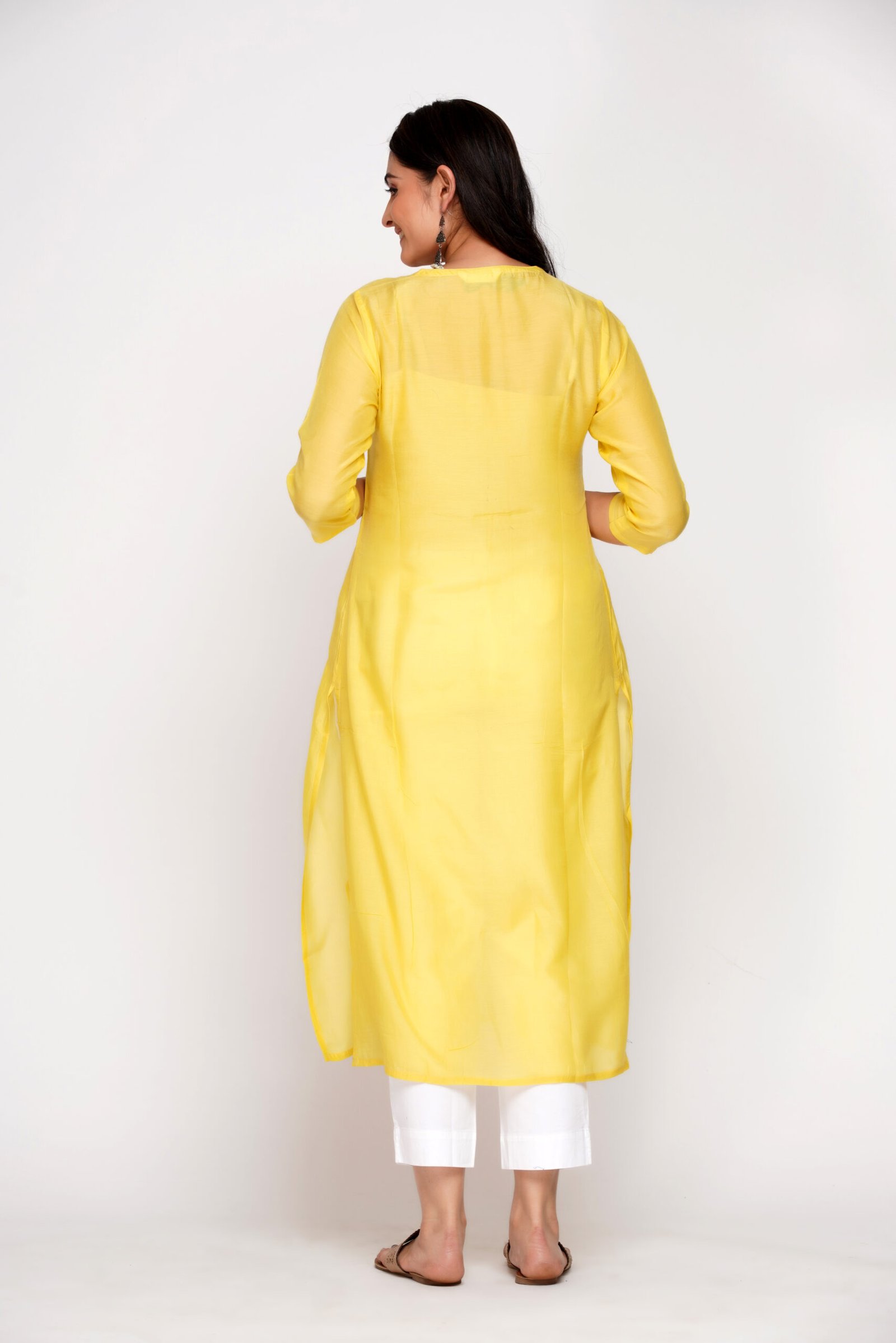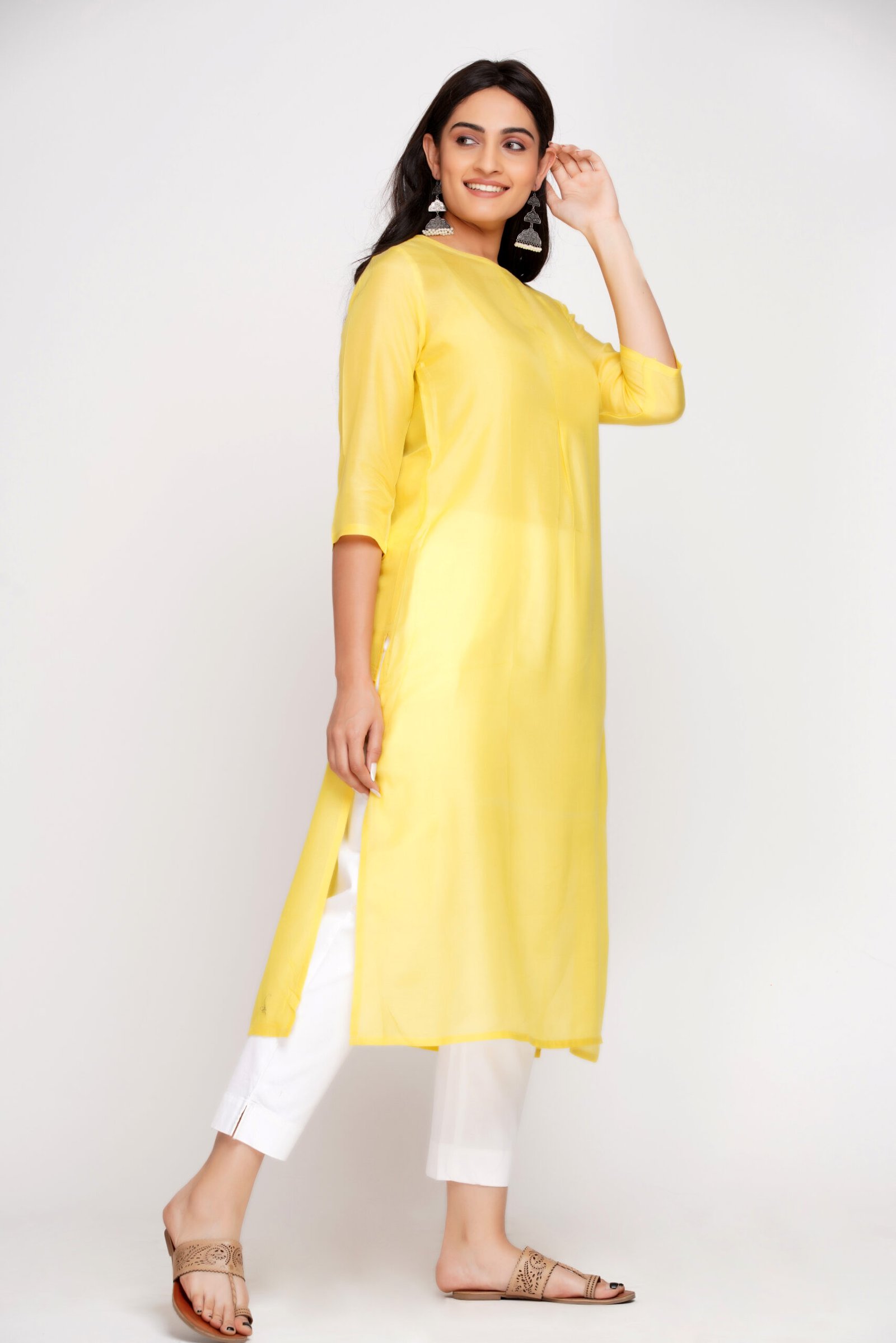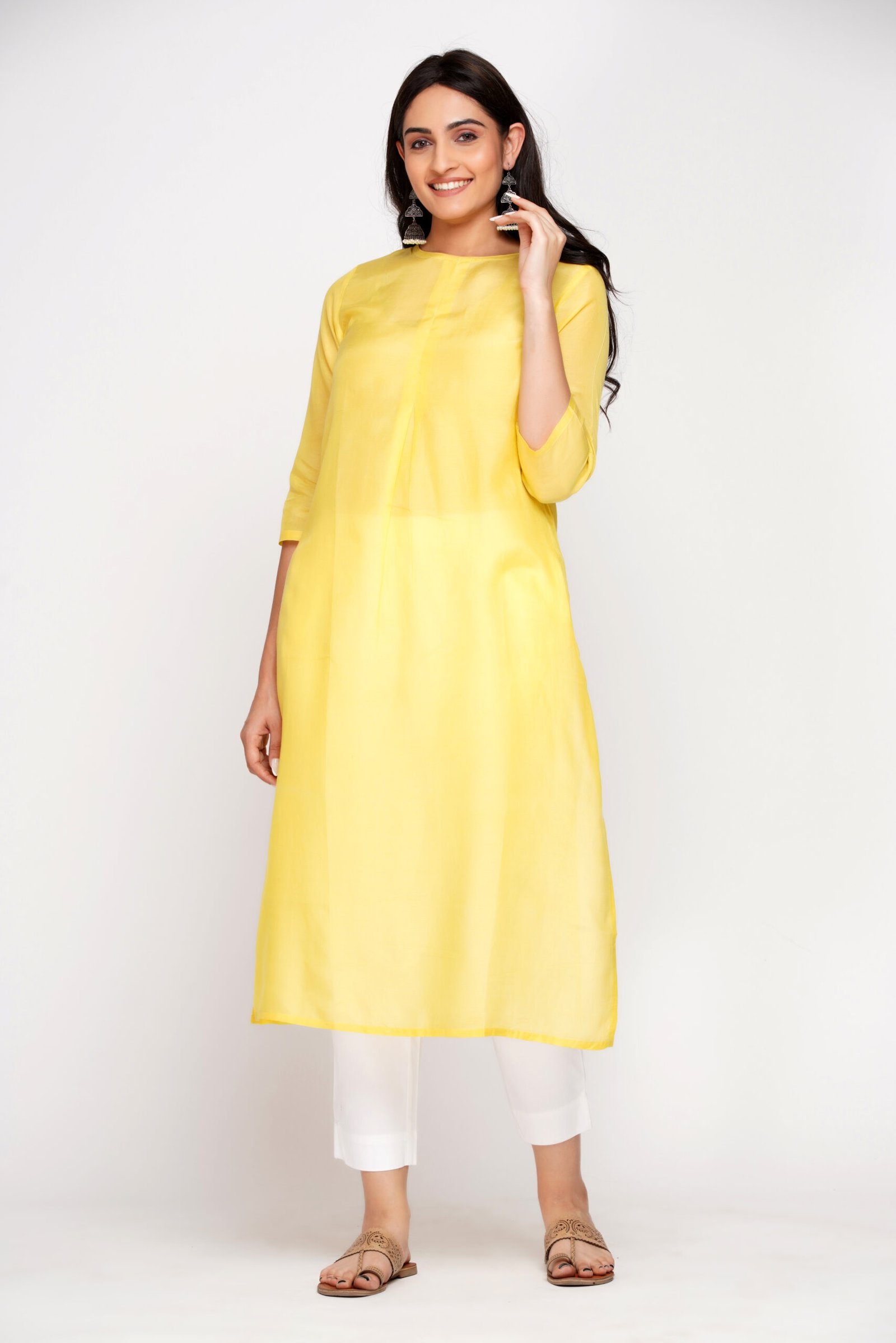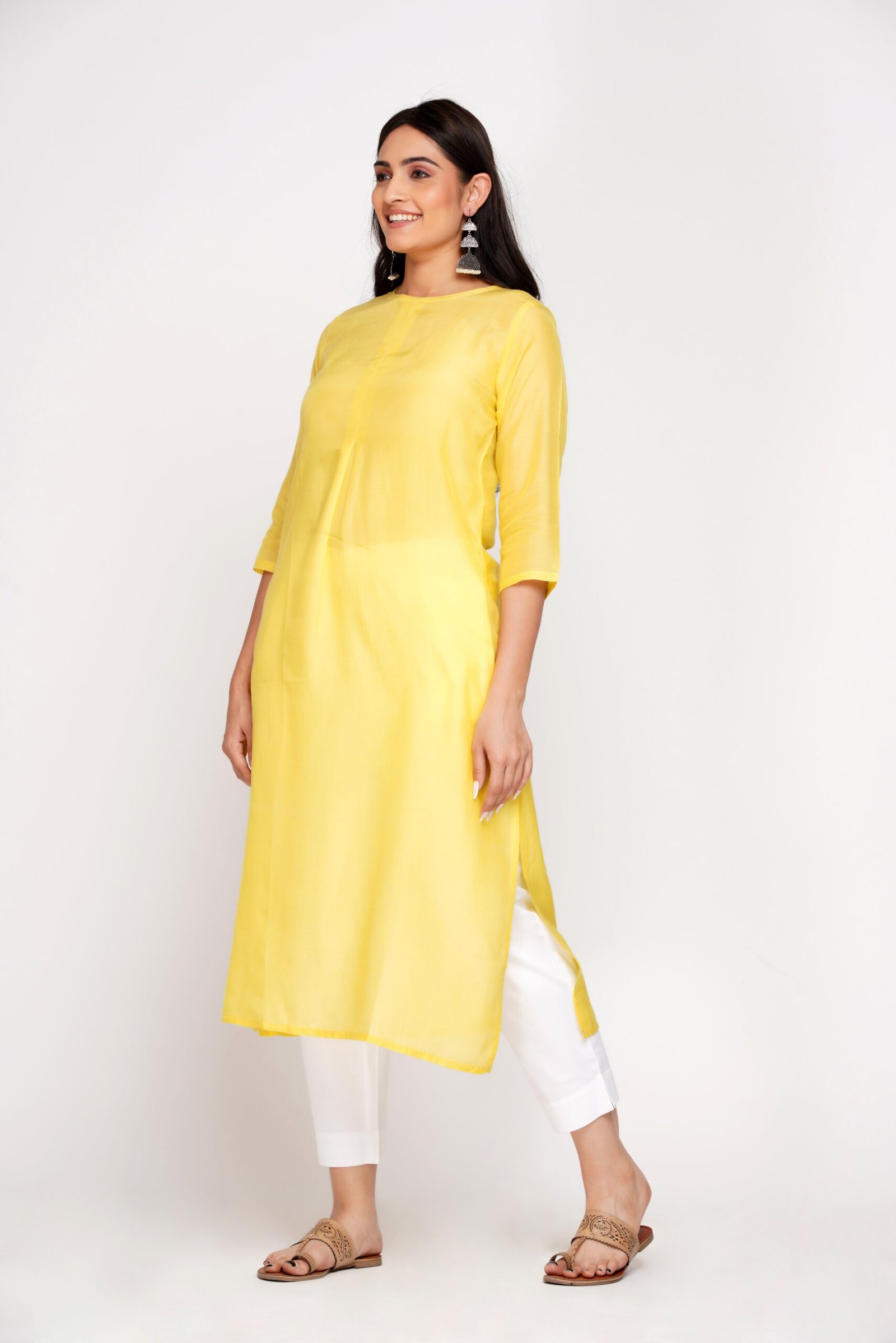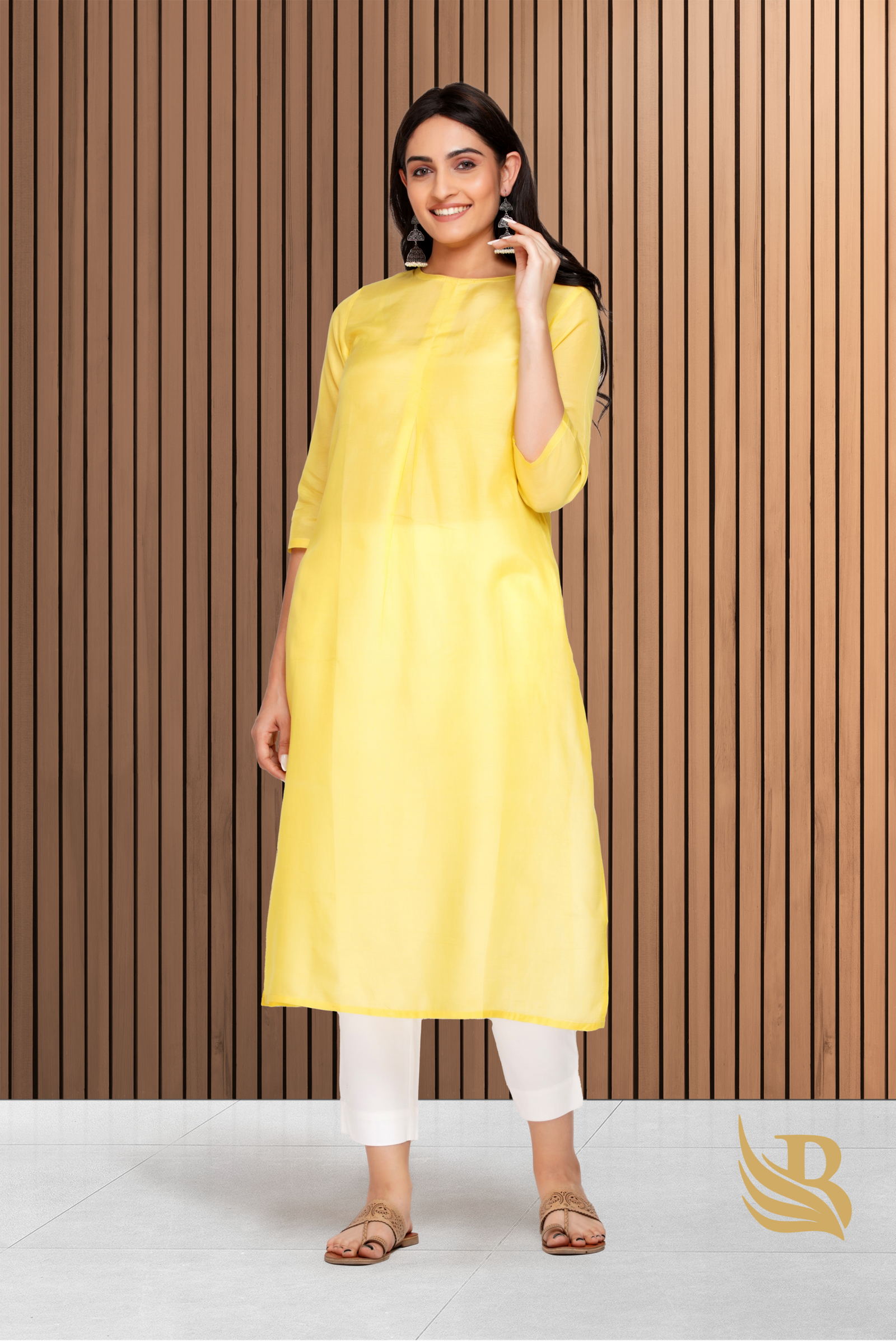 Embrace minimalism and elegance with this sophisticated Yellow Kurta. Crafted from a luxurious blend of Cotton Silk, the fabric offers a subtle sheen and a soft, rich texture. The kurta features a clean, solid design with a stylish Central Panel Detail, making it a versatile canvas for accessorizing. Styled with a simple Round Neck and 3/4th Sleeves, it is perfect for office wear or understated festive elegance.