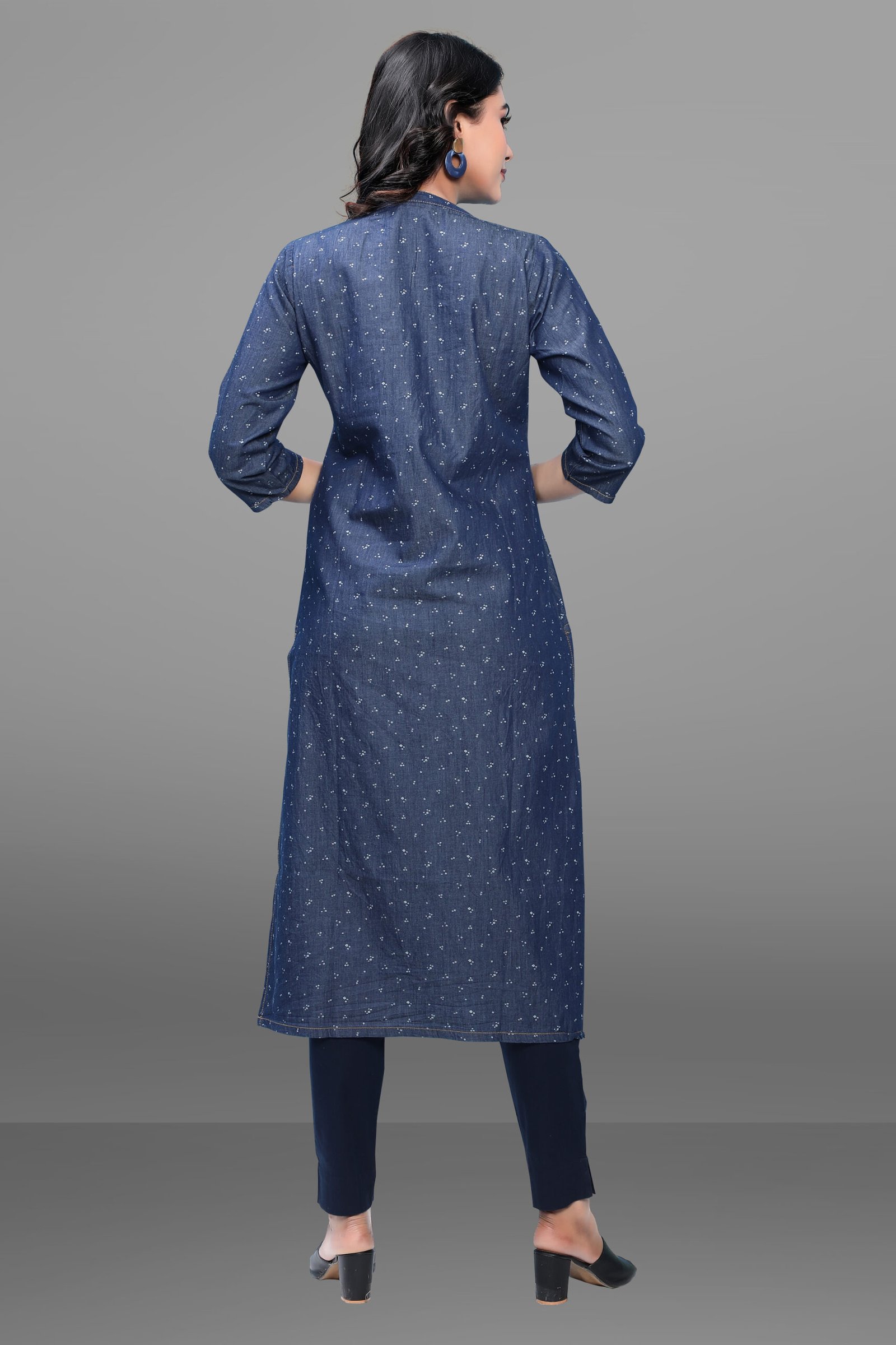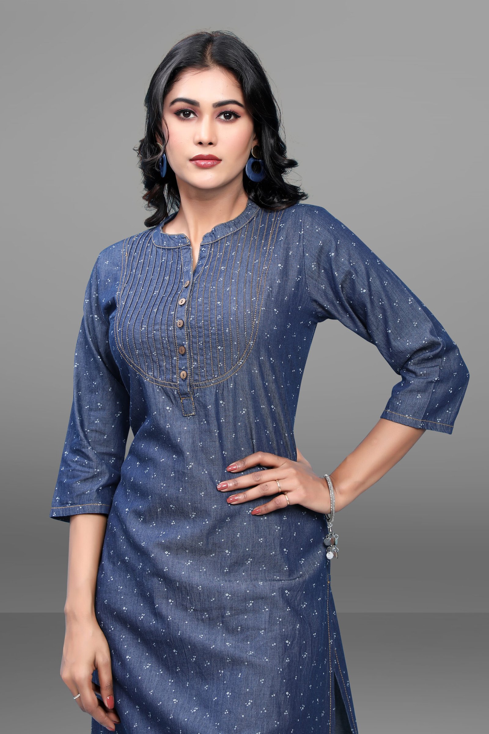 Indigo Blue Pin-Tuck Detail Micro Print Soft Denim Kurta