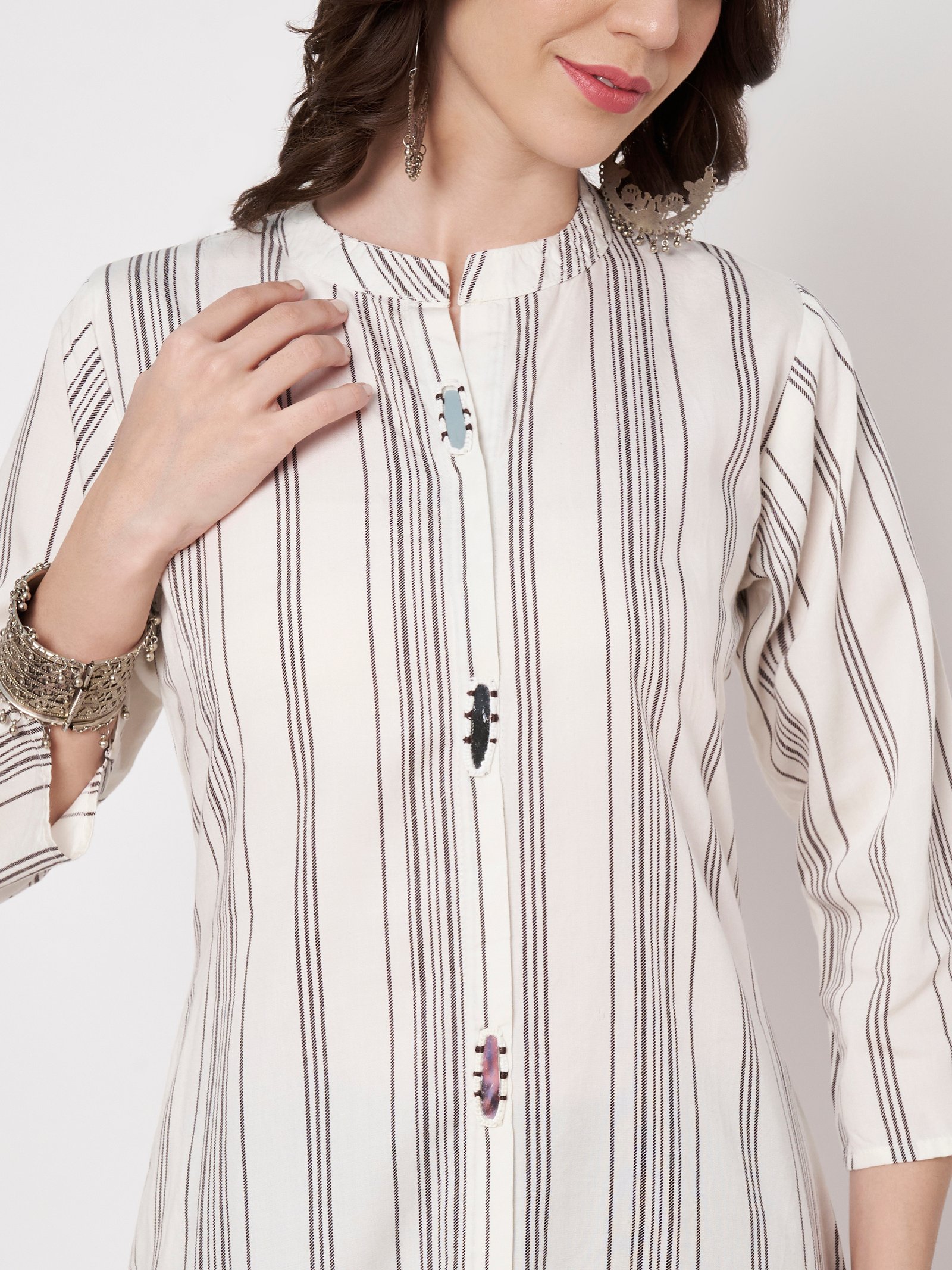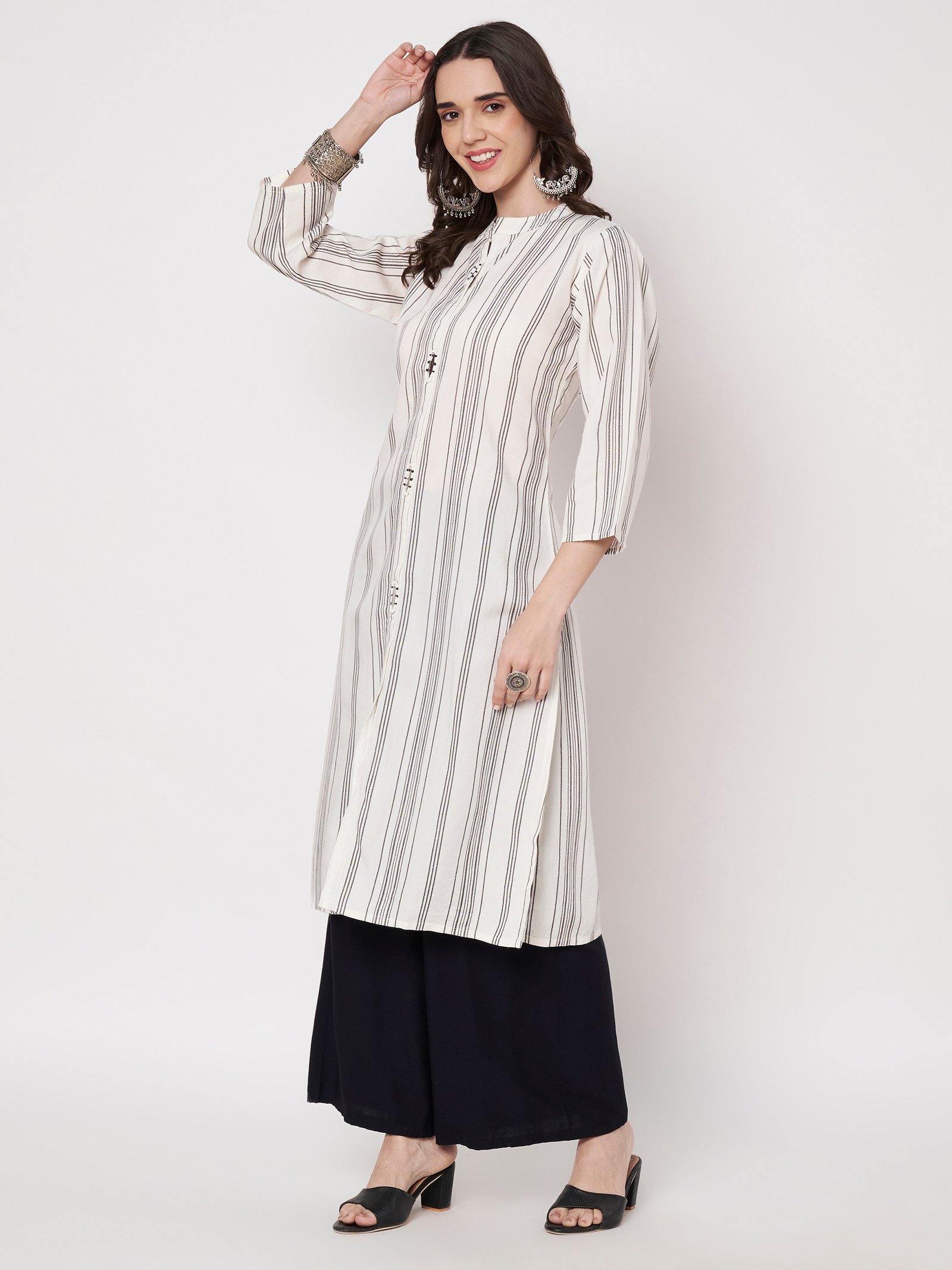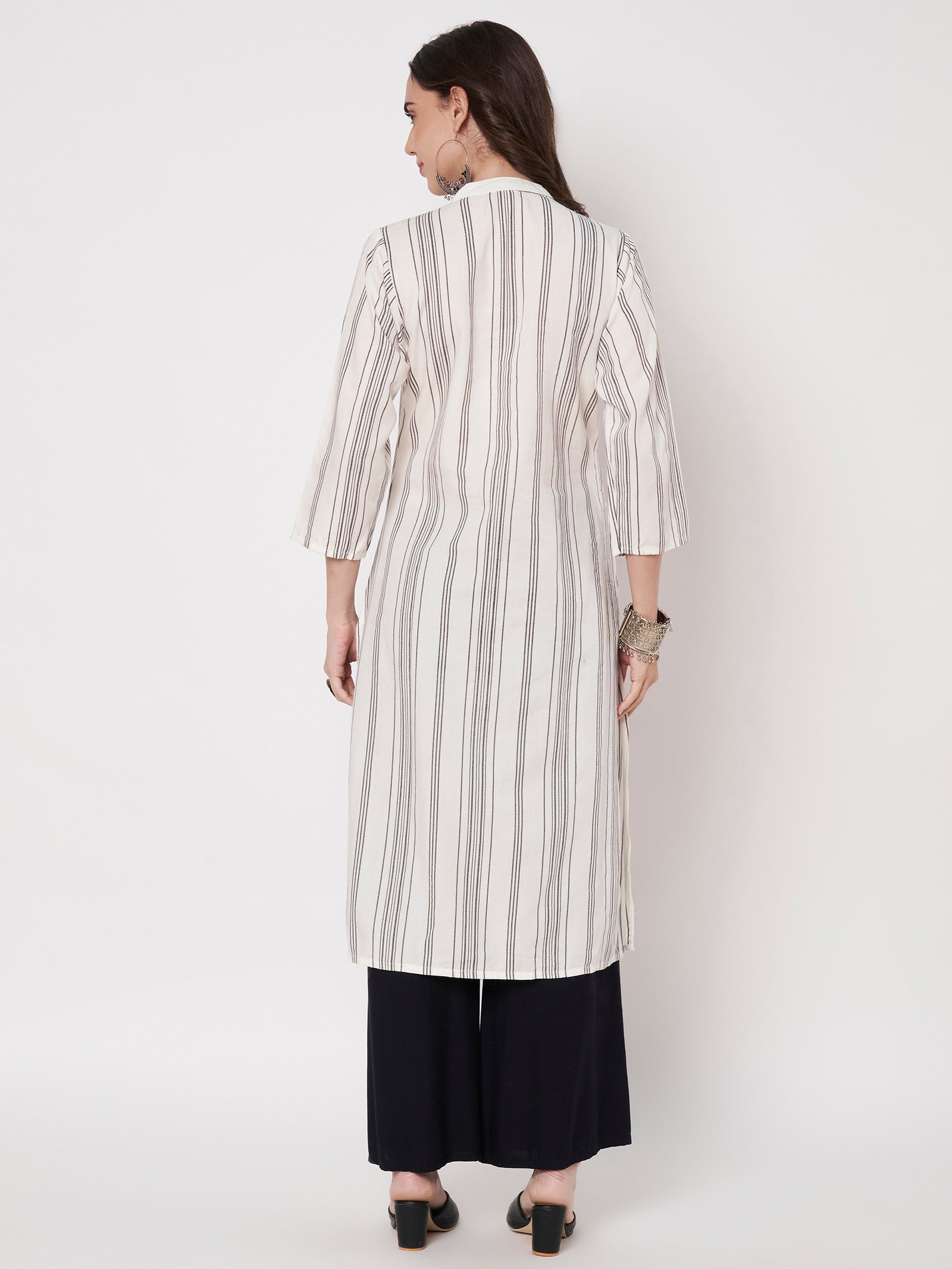 White & Black Striped Pure Cotton Kurta with Placket Detail