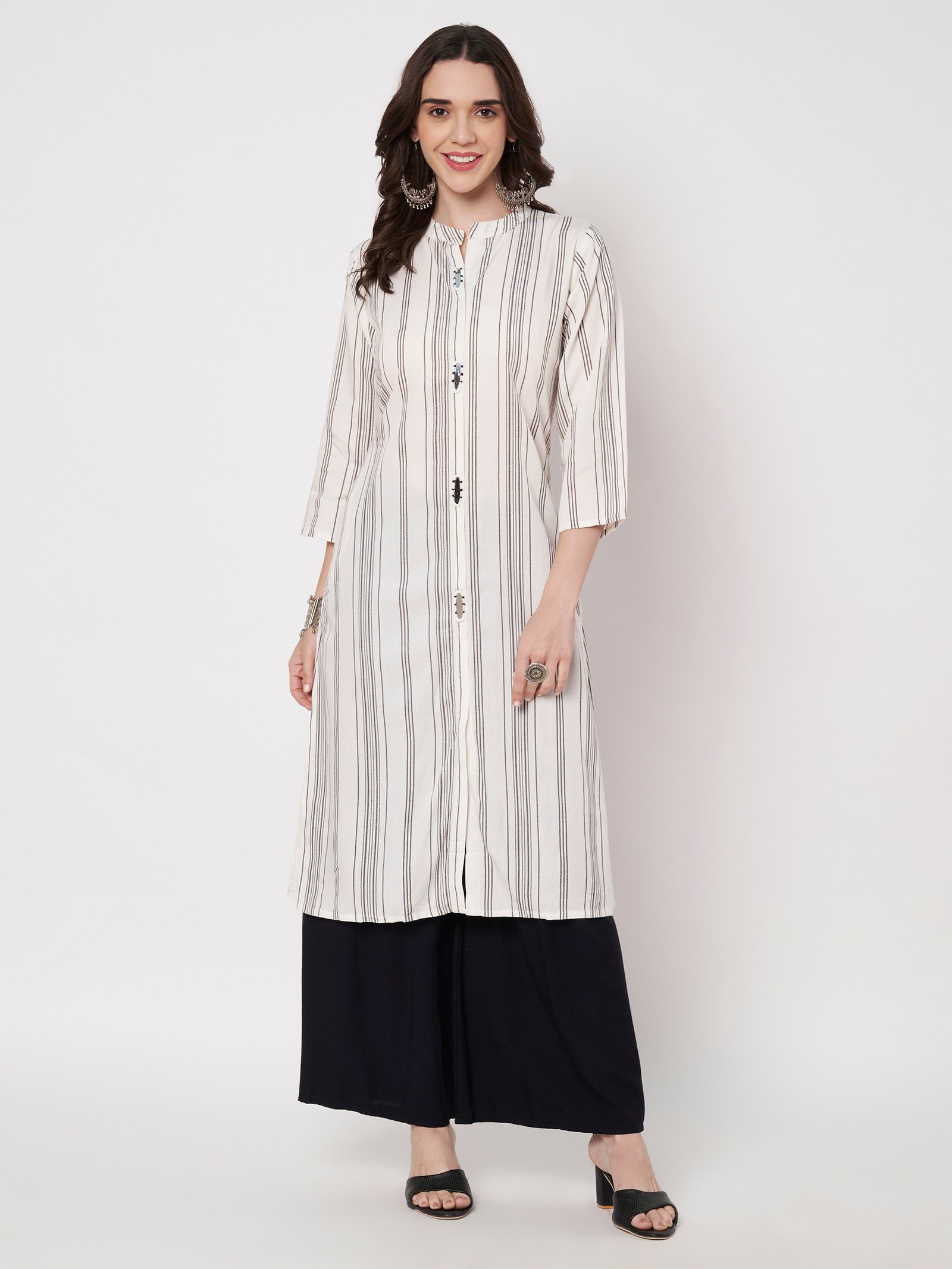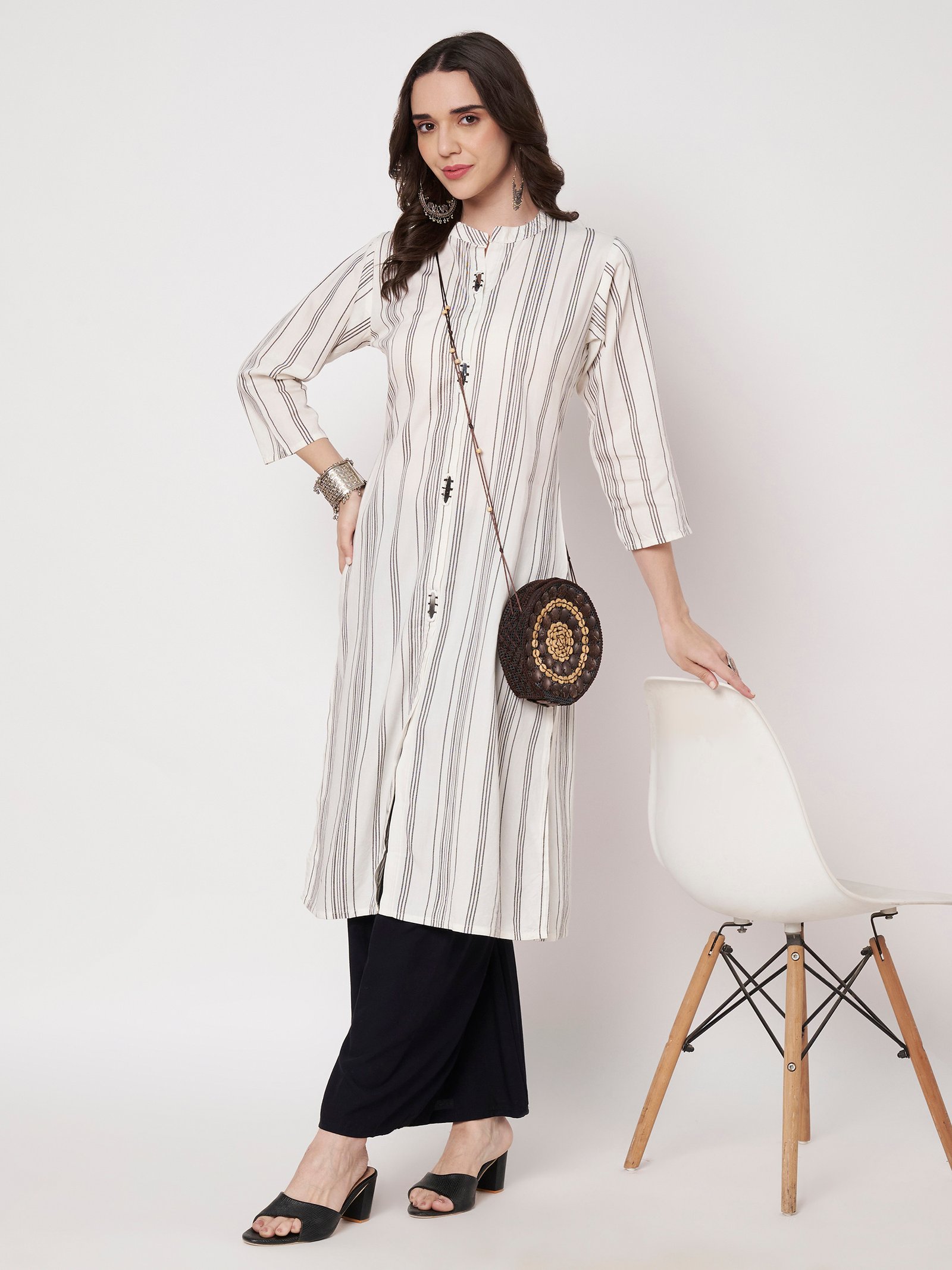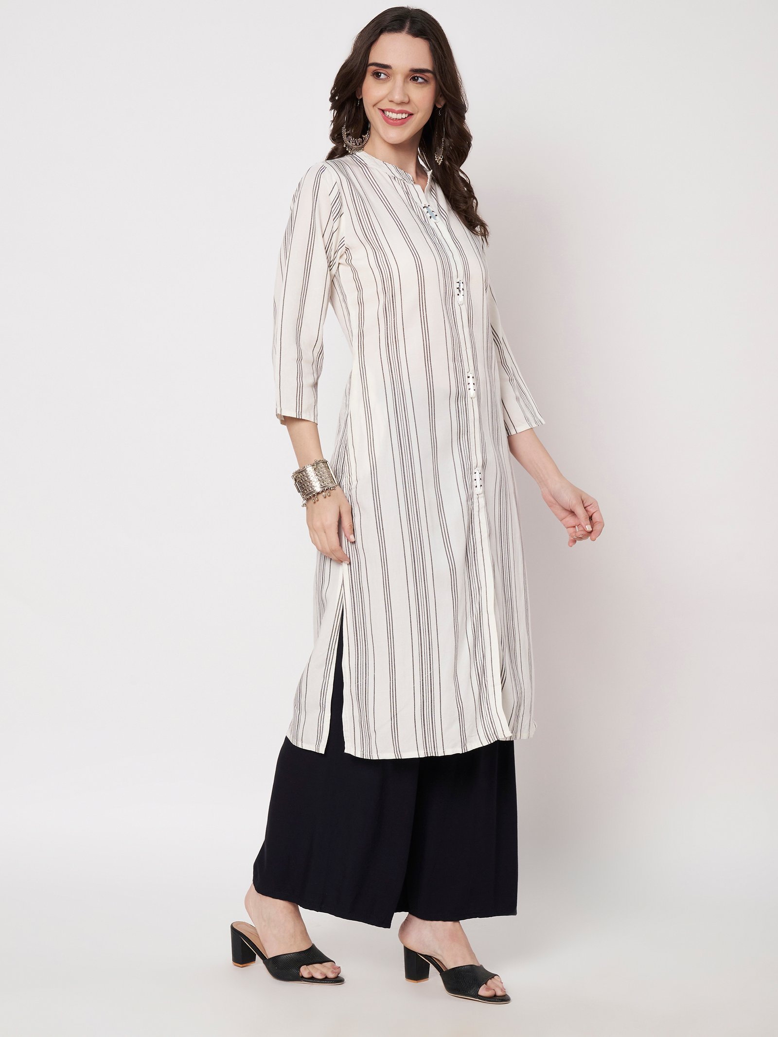 White & Black Striped Pure Cotton Kurta with Placket Detail