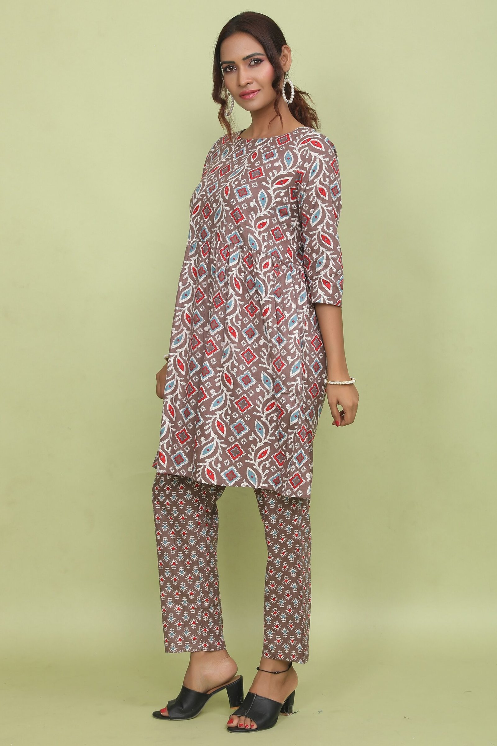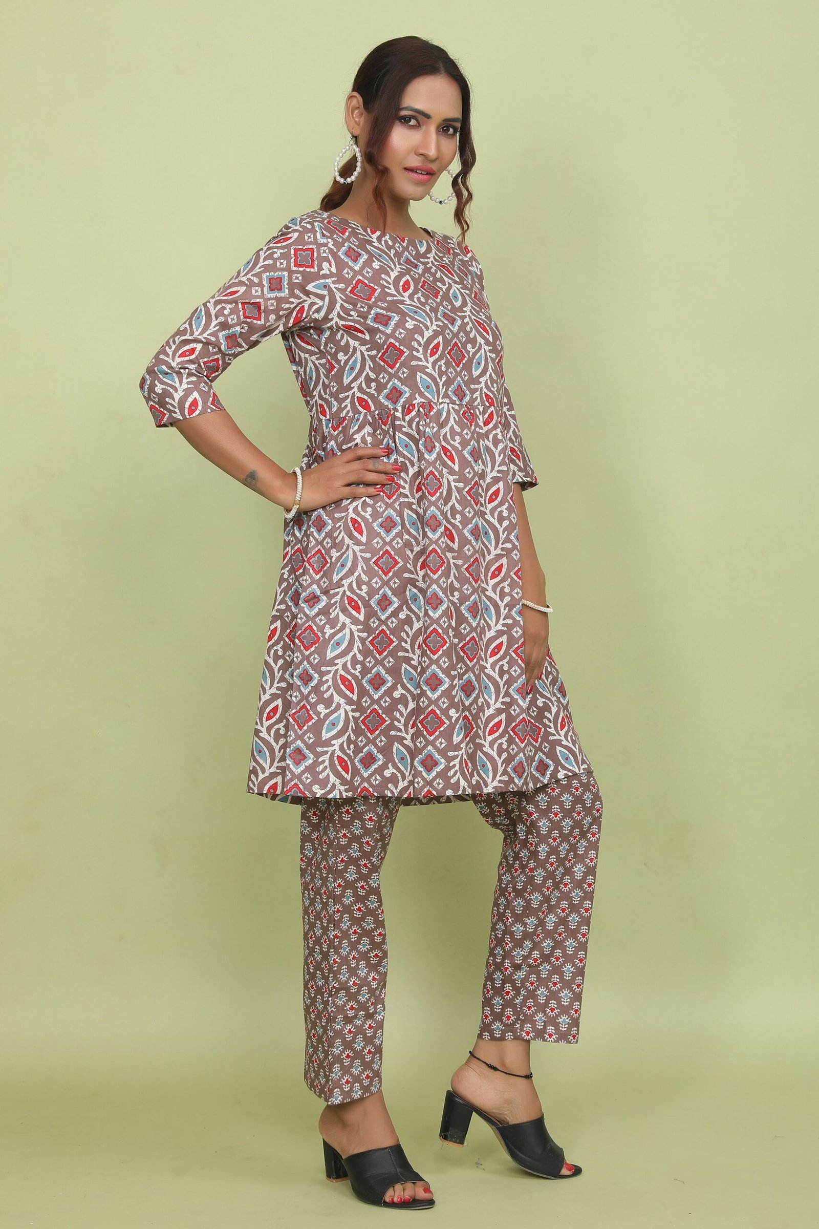 Indulge in the rich tones of this Chocolate Brown Co-ord Set. Crafted from Super Cotton (100% Pure Cotton), this outfit ensures breathable, full-day comfort. The set features a trendy Short Anarkali Kurti with a vibrant geometric-leafy print, paired with contrasting Micro-Print Trousers for a stylish mixed-pattern appeal. Finished with a Boat Neck, 3/4th Sleeves, and functional pockets, it is the perfect blend of modern style and ease.