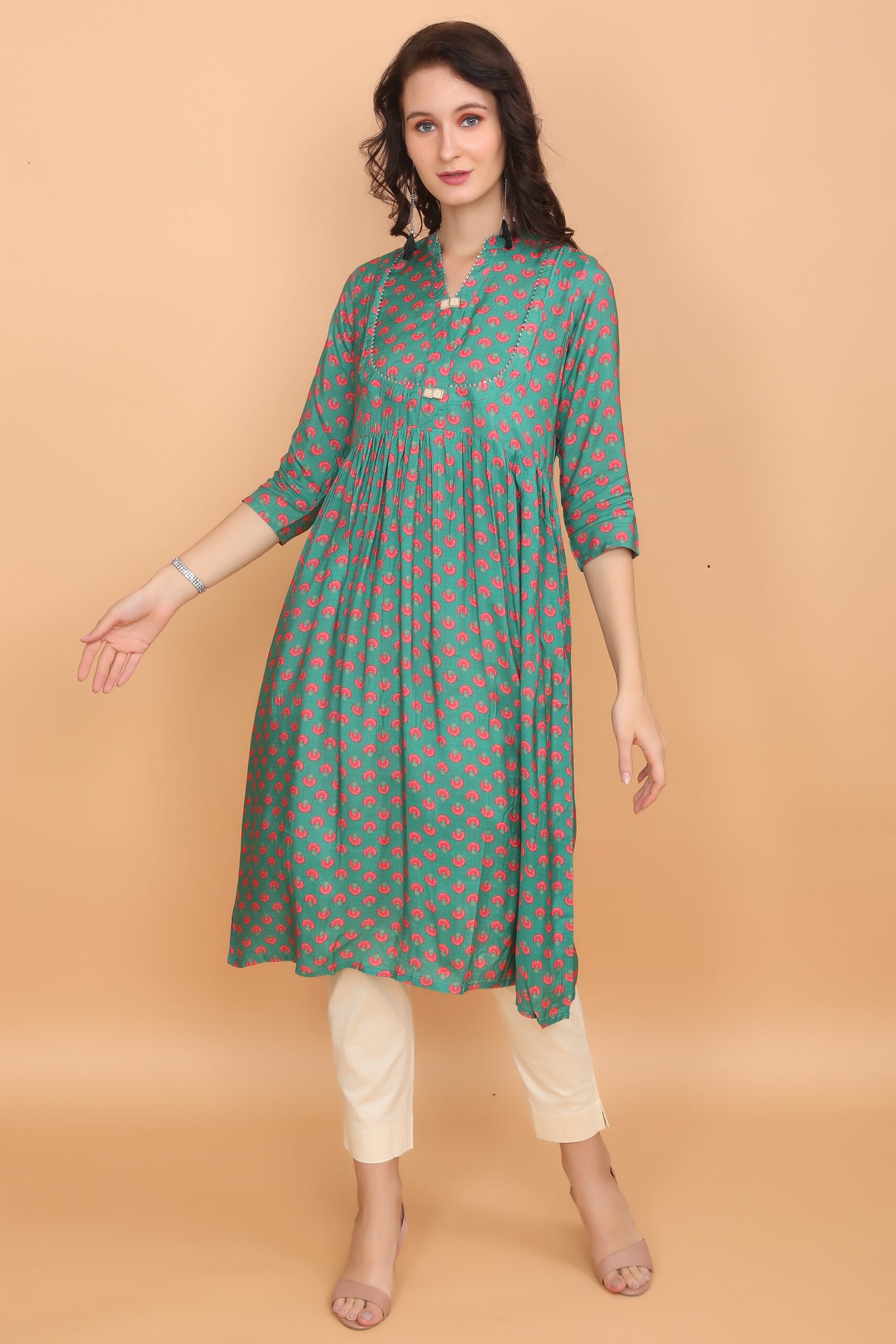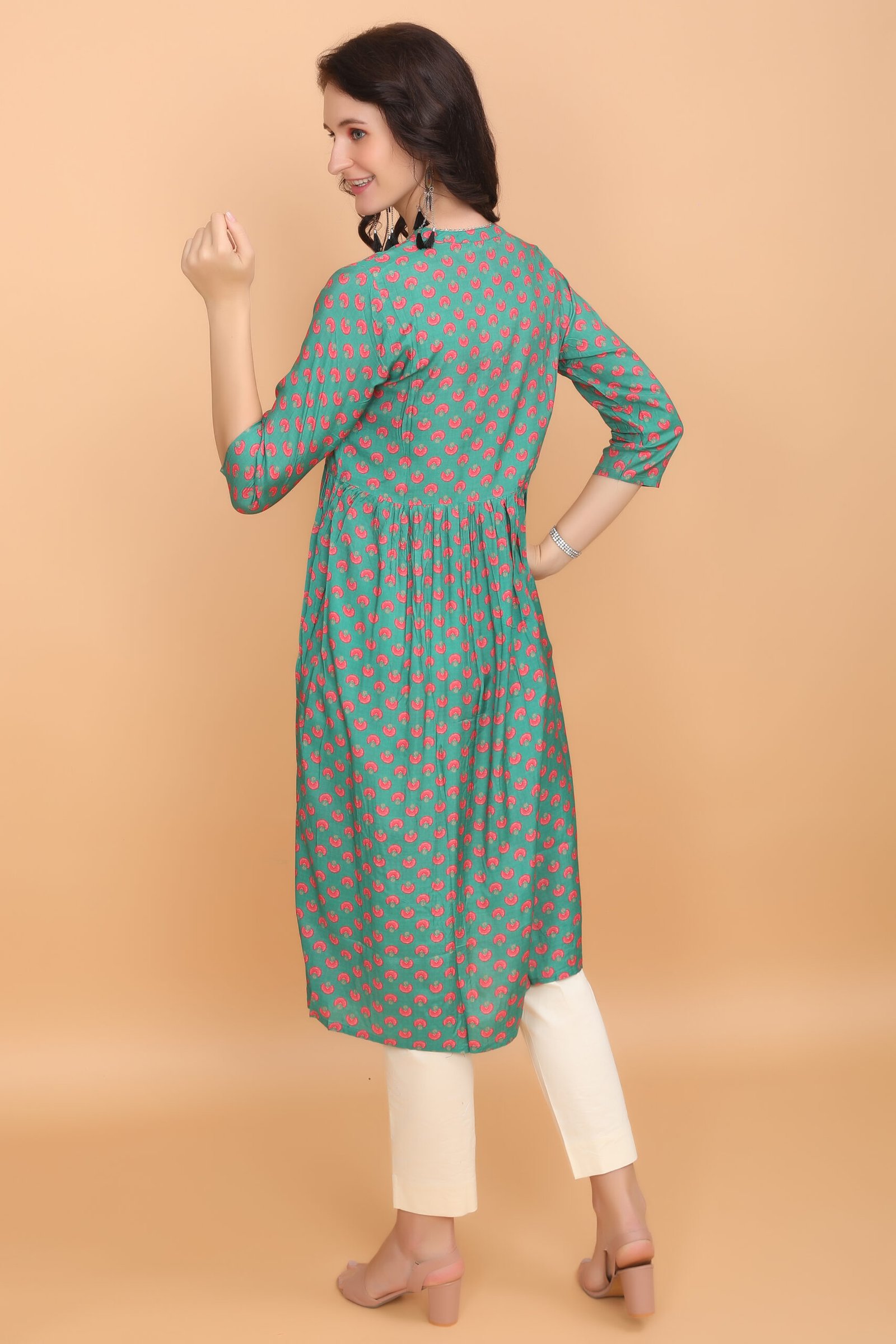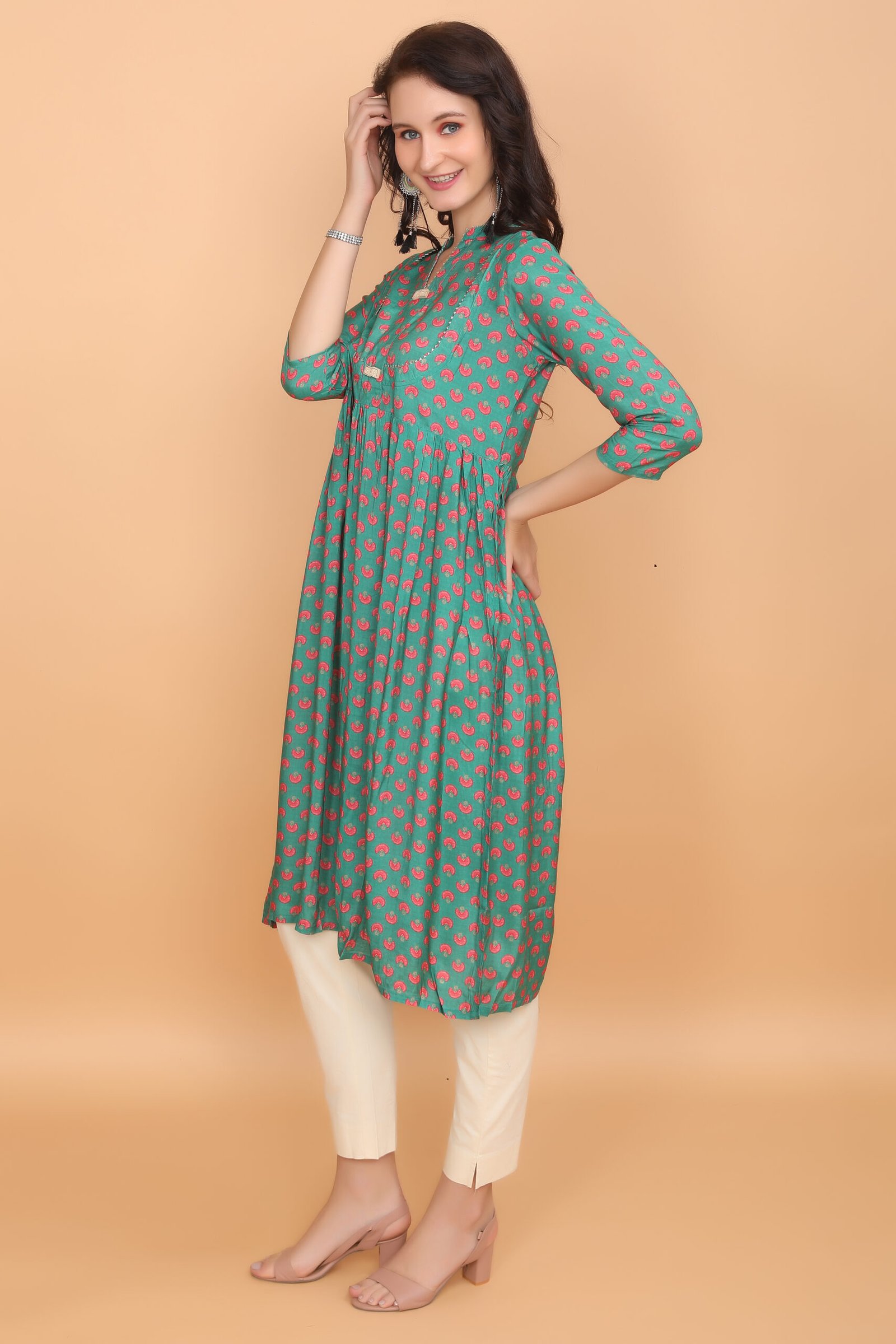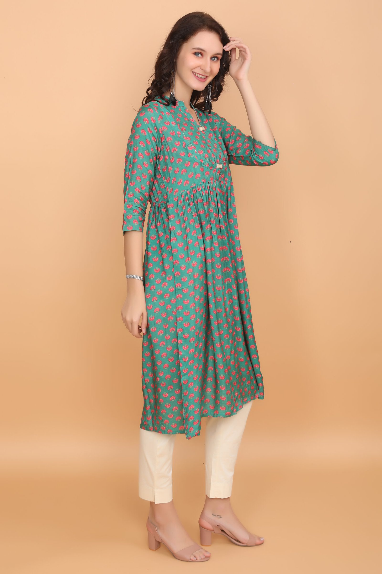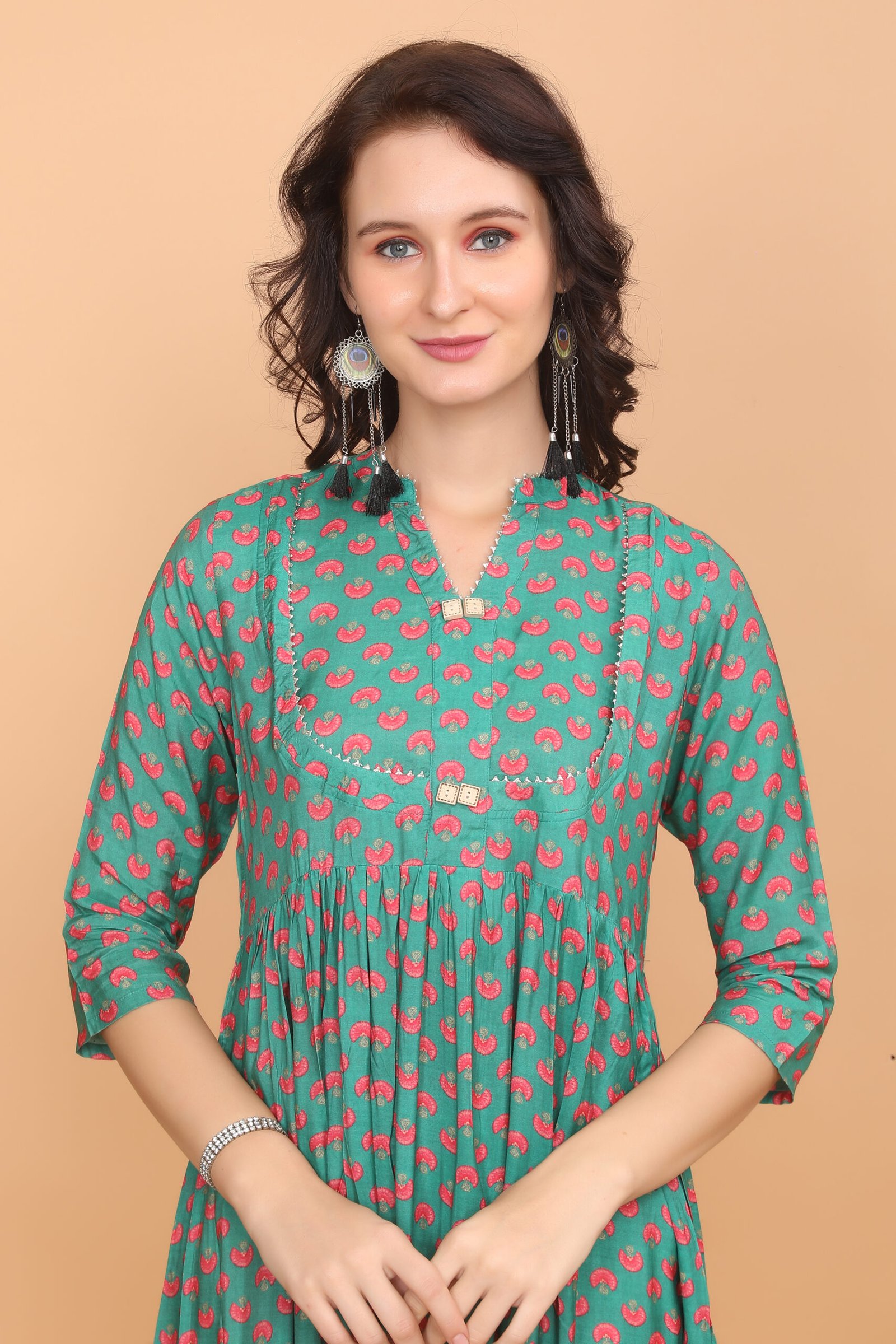 Infuse your wardrobe with vibrant charm using this Green & Red Kurta. Crafted from premium Muslin Silk (100% Viscose), the fabric is known for its lightweight and flowy texture, ensuring a graceful drape. The kurta features a dense pattern of small Red Floral / Semicircular Motifs on a rich green base. Designed in a stylish Flared (Anarkali) Silhouette with gathers at the yoke and a chic V-Neck with Collar Detail, it is perfect for a lively, comfortable look.