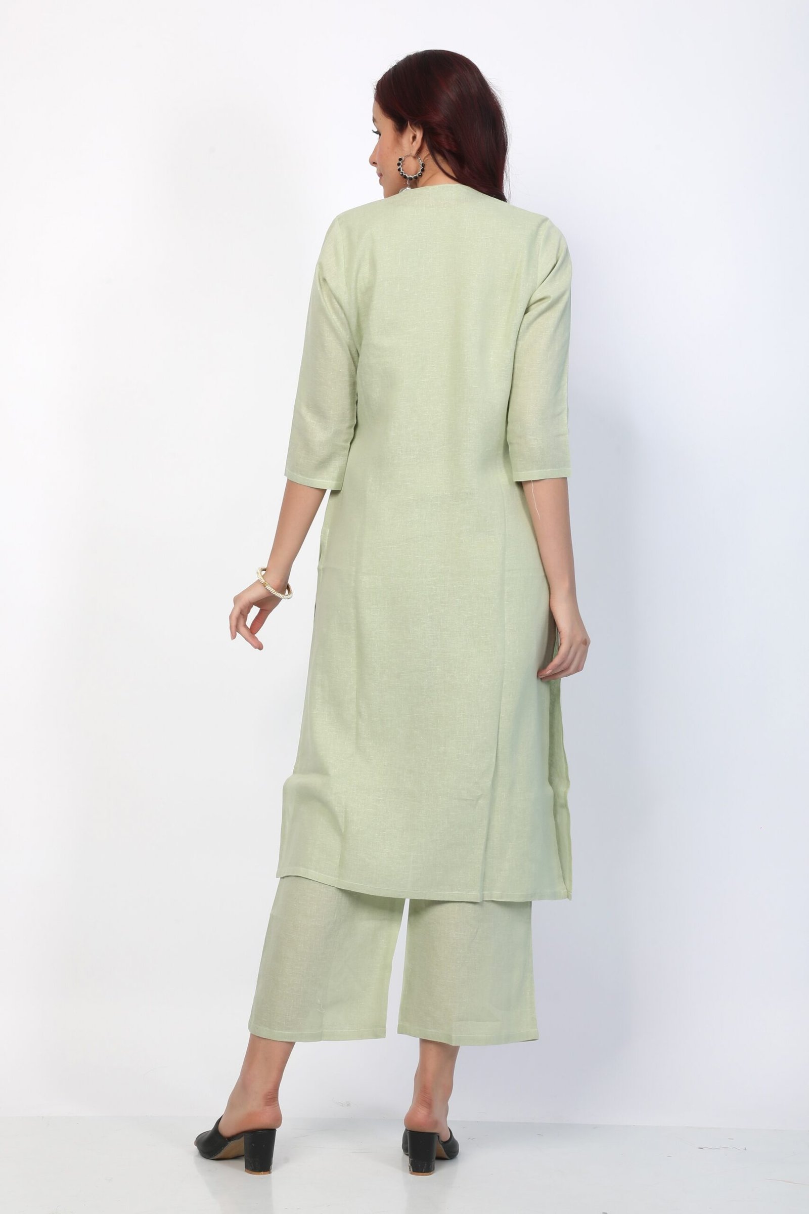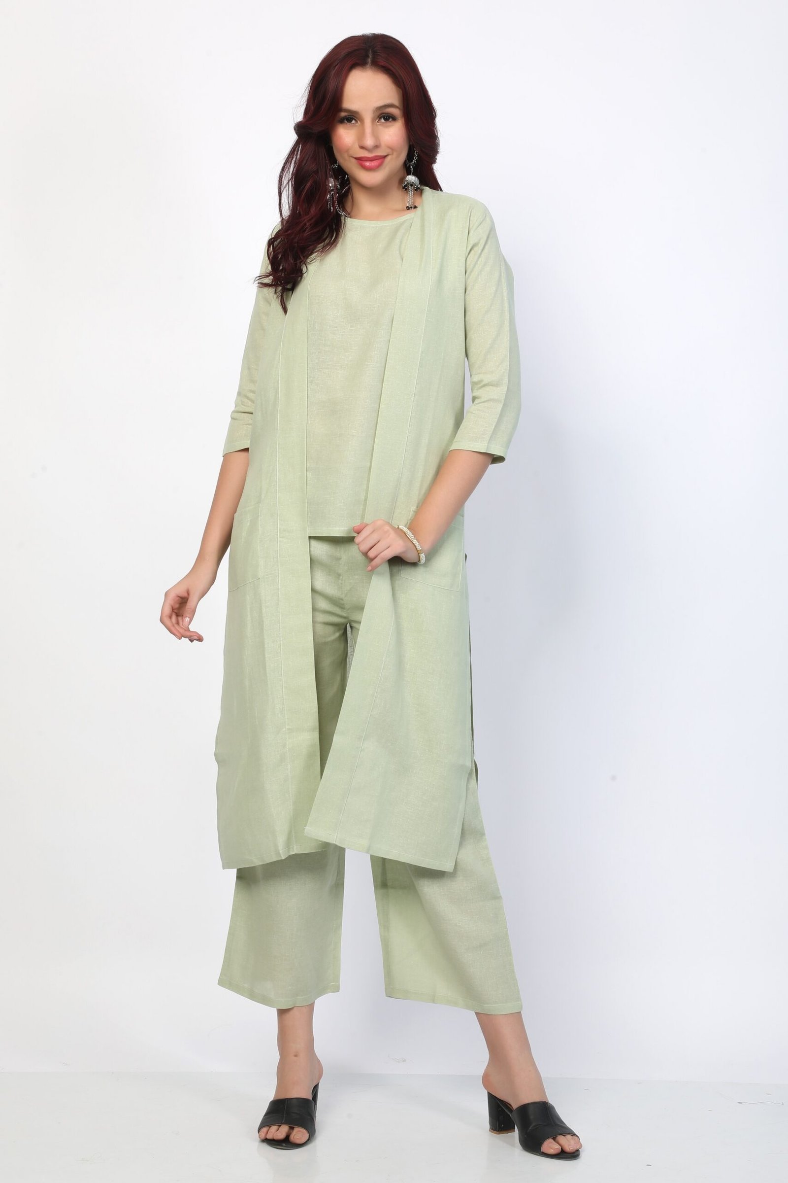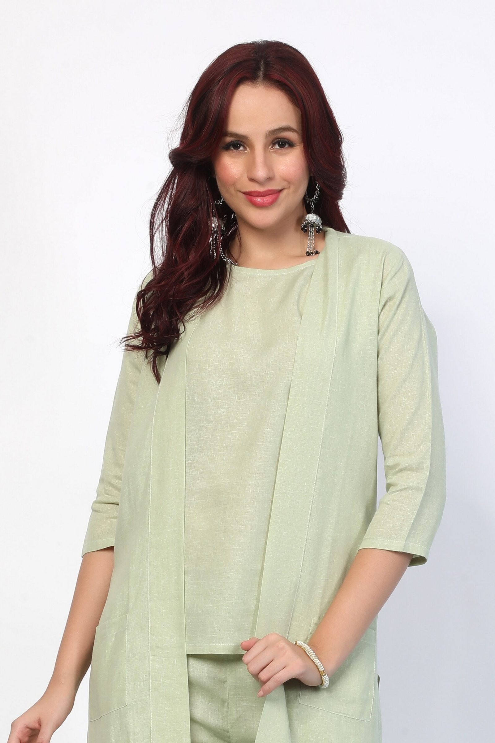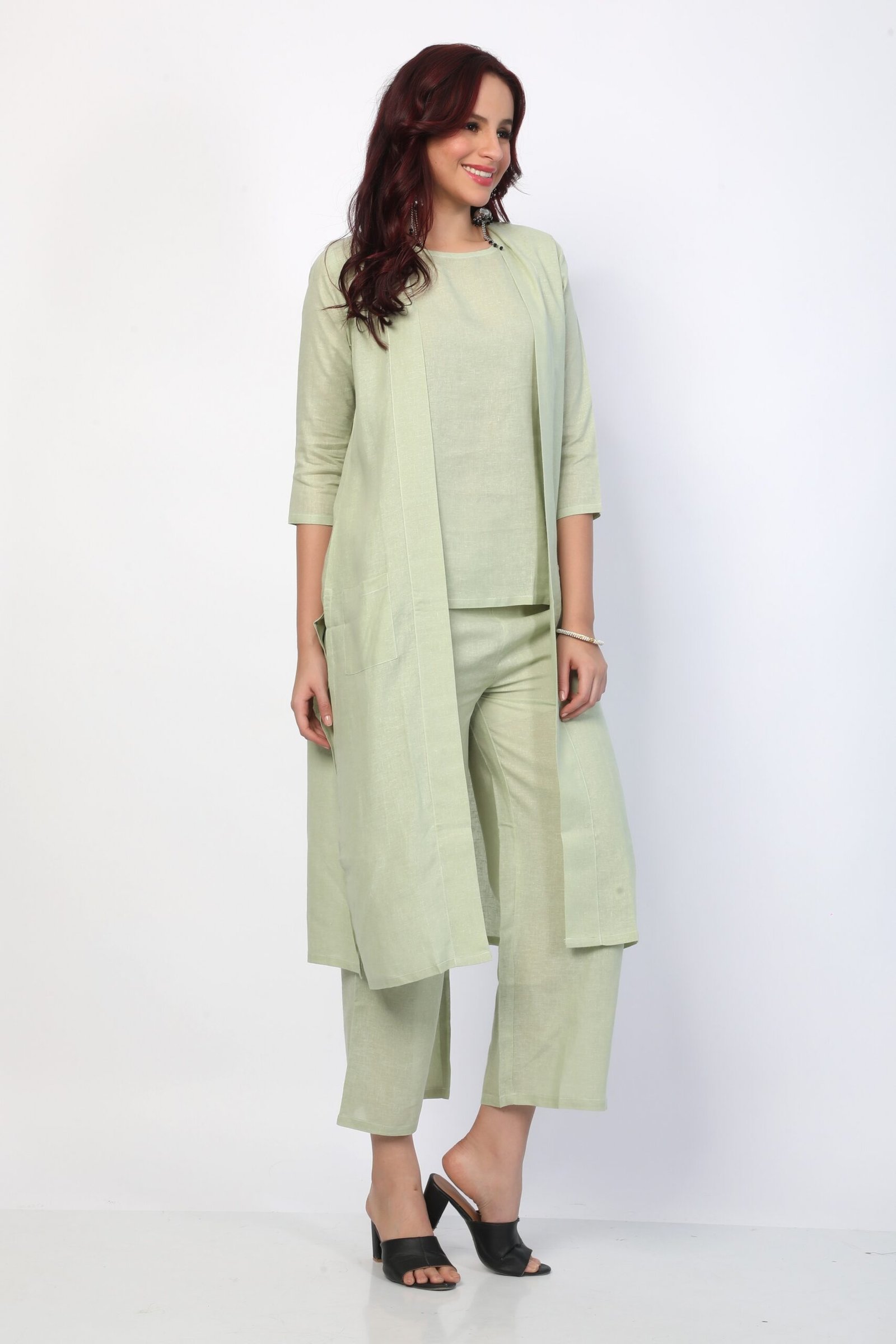 Achieve a polished, smart-casual look with this sophisticated Mint Green 3-Piece Set. Crafted from a premium Linen Blend (60% Linen, 40% XL Linen), this outfit offers a structured yet breathable feel. The set includes a Sleeveless Inner Top, comfortable pants, and a stylish Knee-Length Open Jacket with functional patch pockets and 3/4th sleeves. Perfect for office wear or elevated day events.