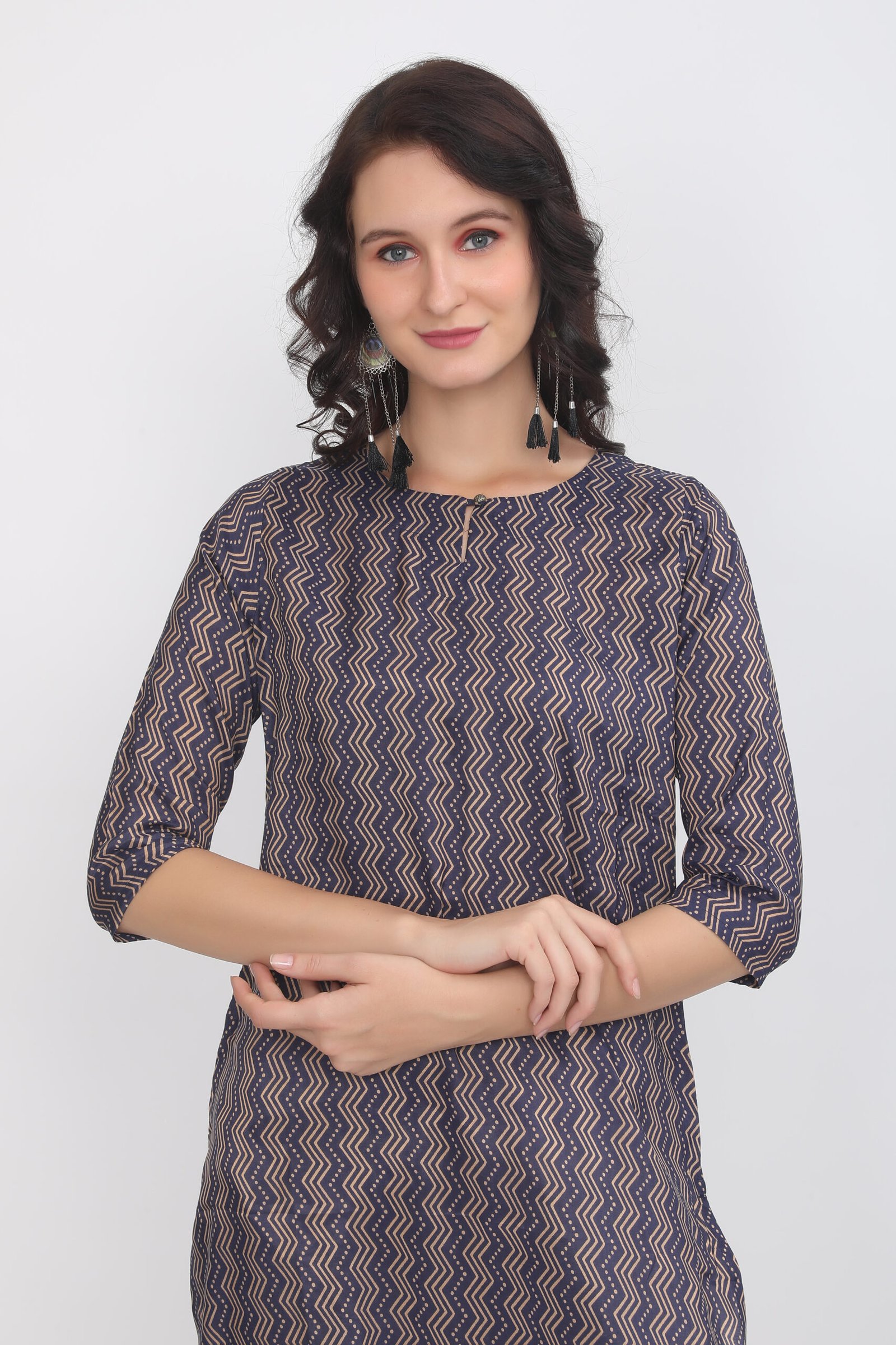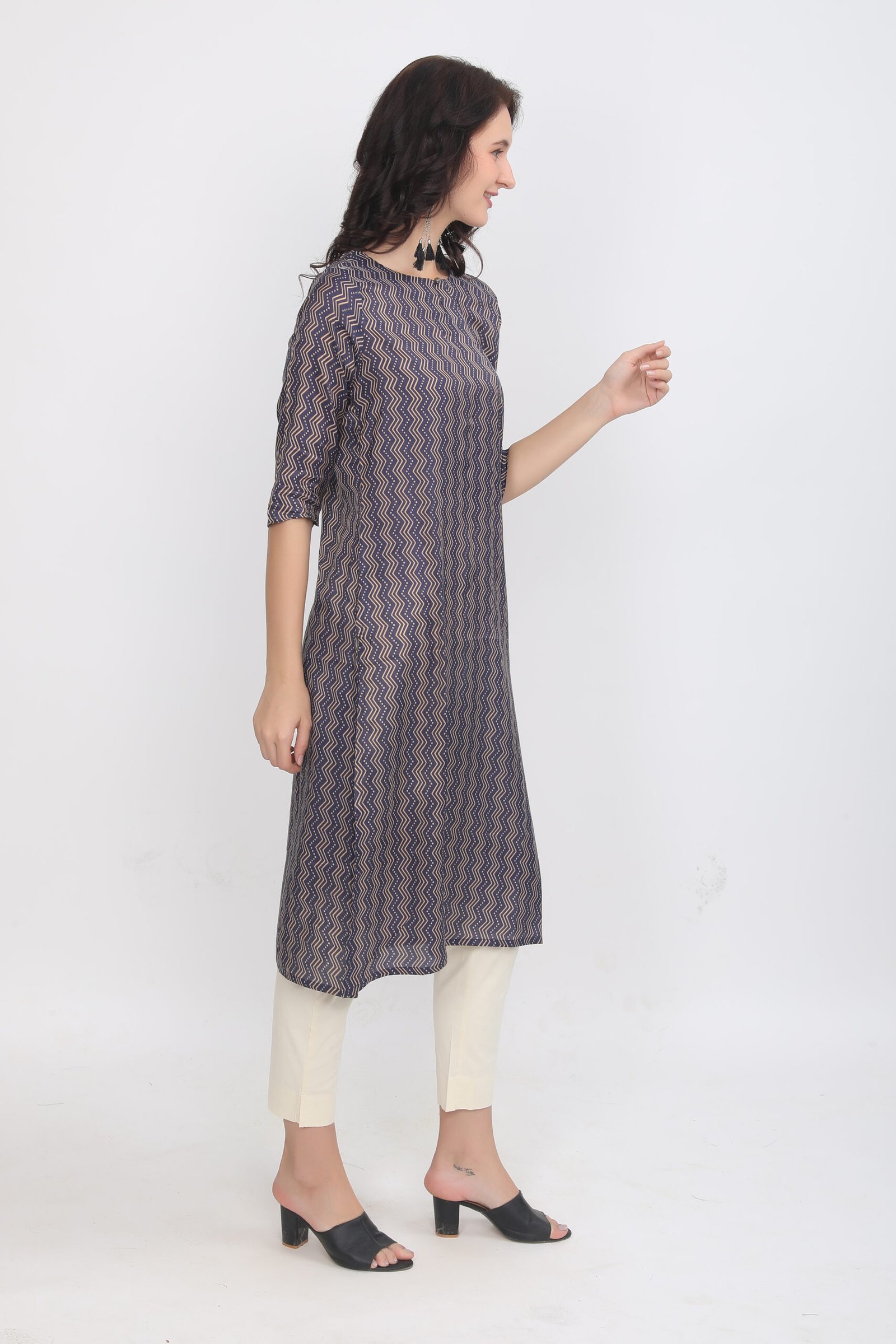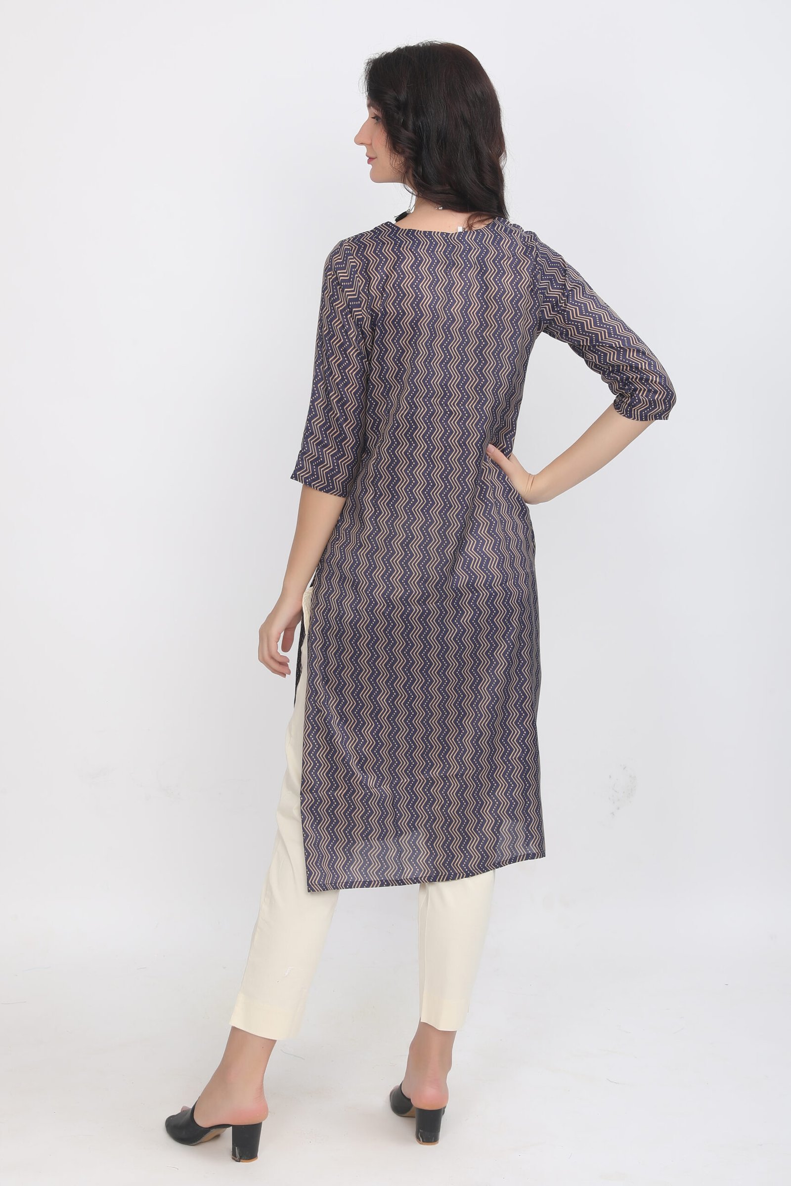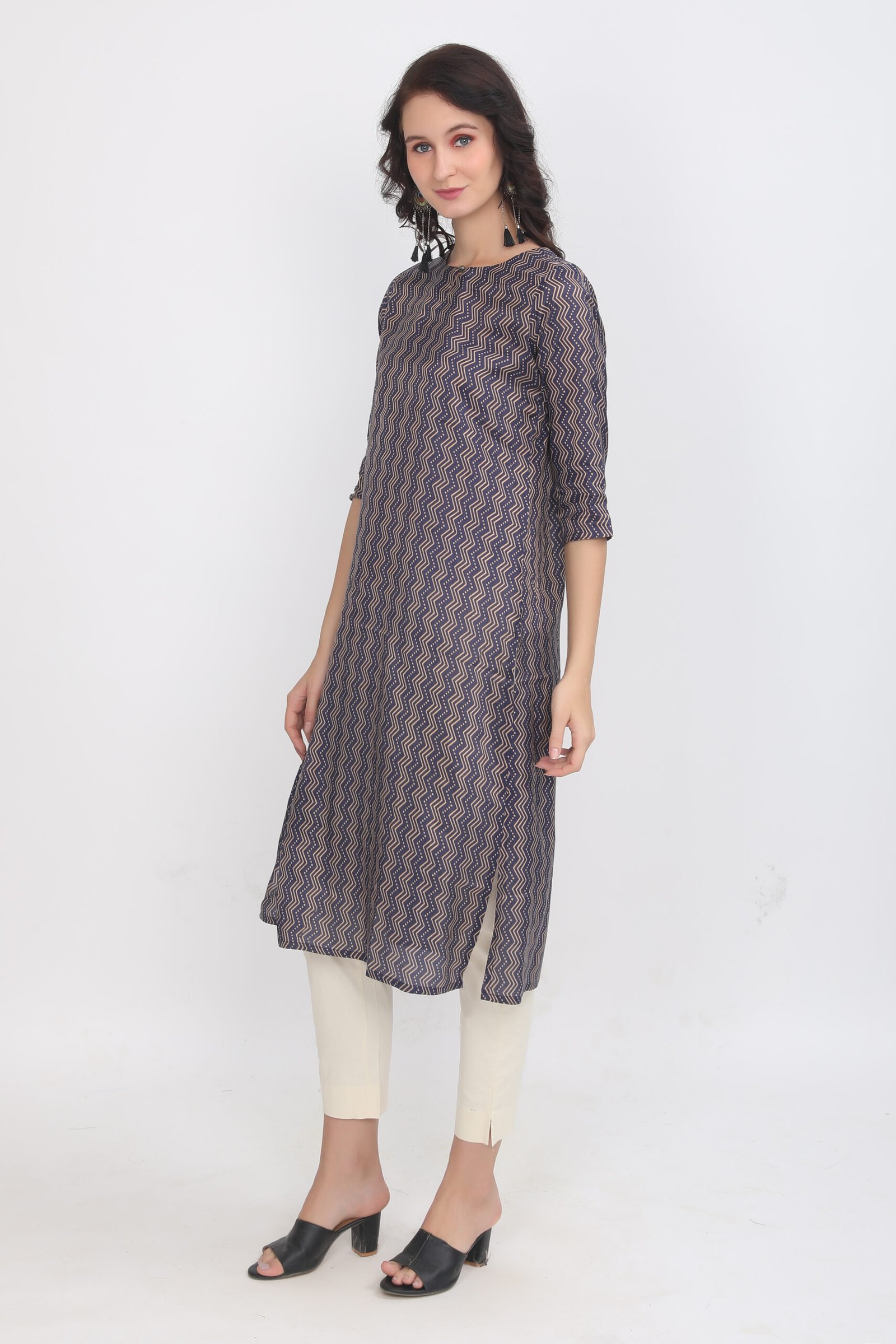 Be the first to review “Navy & Golden Wavy Chevron Print Muslin Silk Kurta”