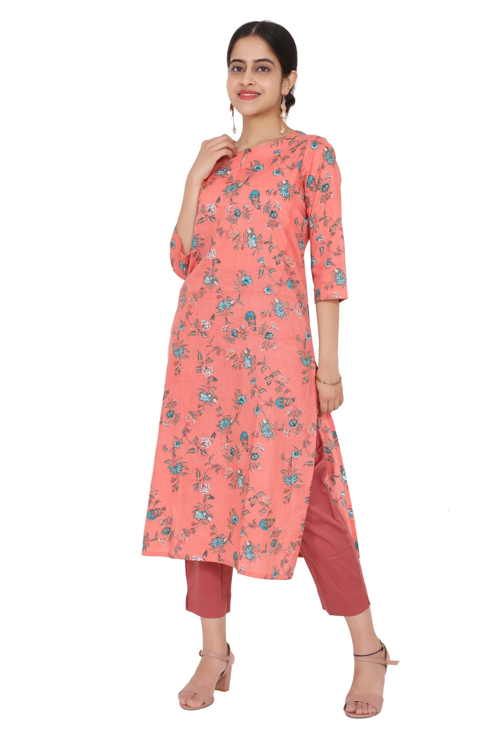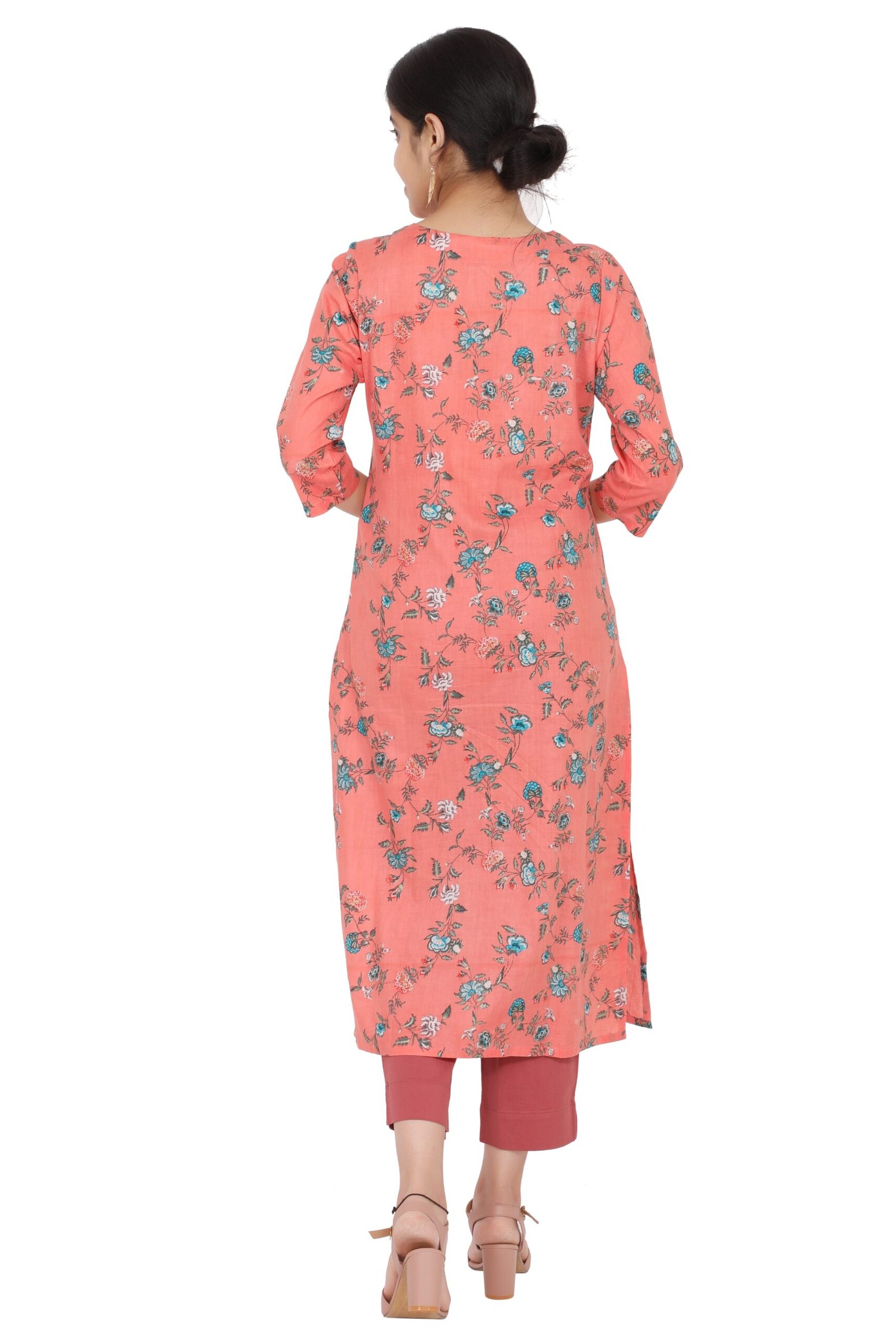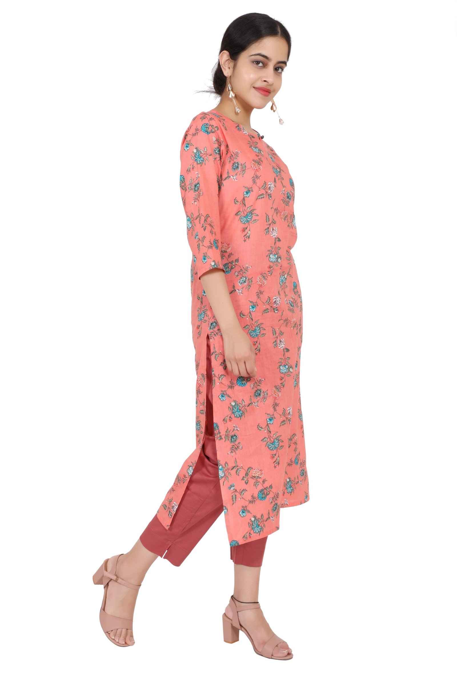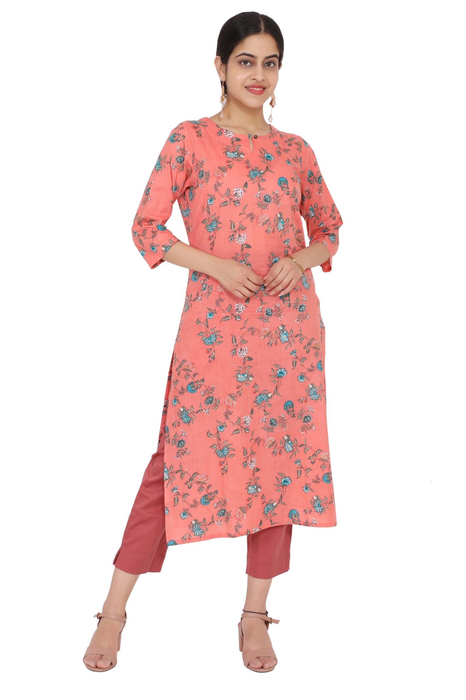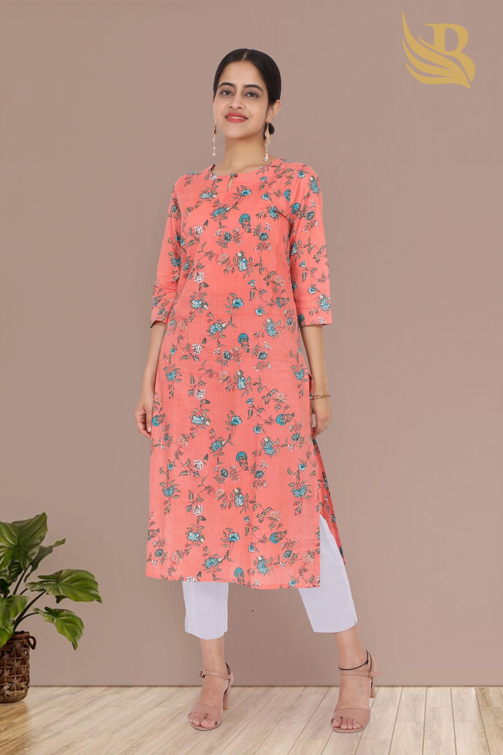 Embrace the charm of summer with this beautiful Pink Kurta. Crafted from feather-light Pure Mul Cotton, this fabric offers the unique luxury of getting softer with every wash. The kurta features a delicate Blue Floral Vine Print on a warm pink base, creating a refreshing contrast. Designed with a classic Round Neck with a Keyhole detail and 3/4th Sleeves, it is the perfect choice for effortless, breezy casual wear.