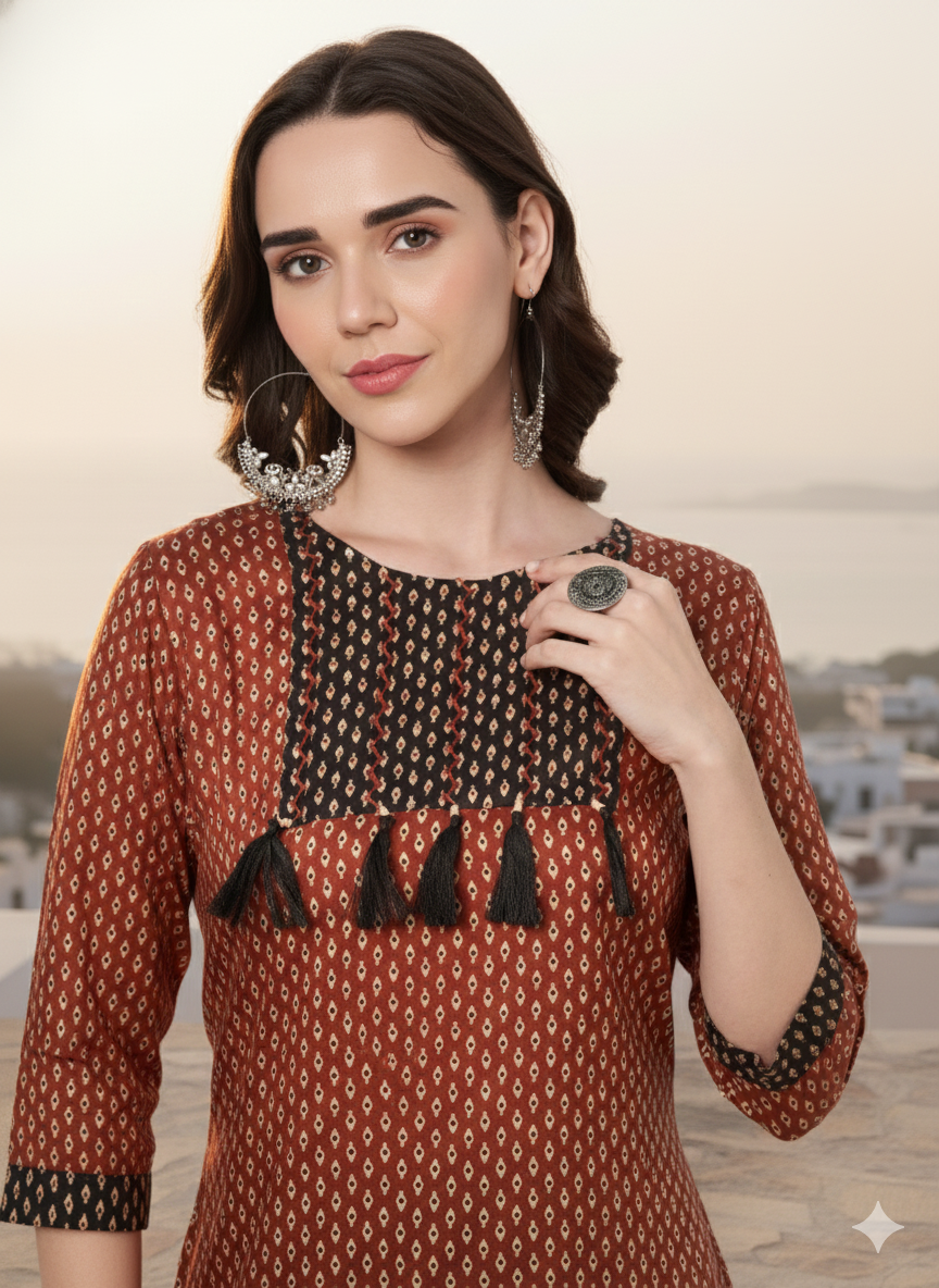 Design Detail: Contrast Black Yoke with Hanging Tassels