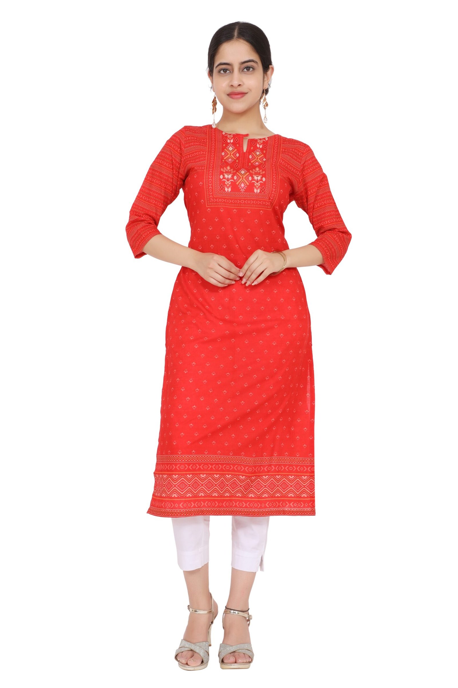 Color: Red with White/Beige Geometric Print