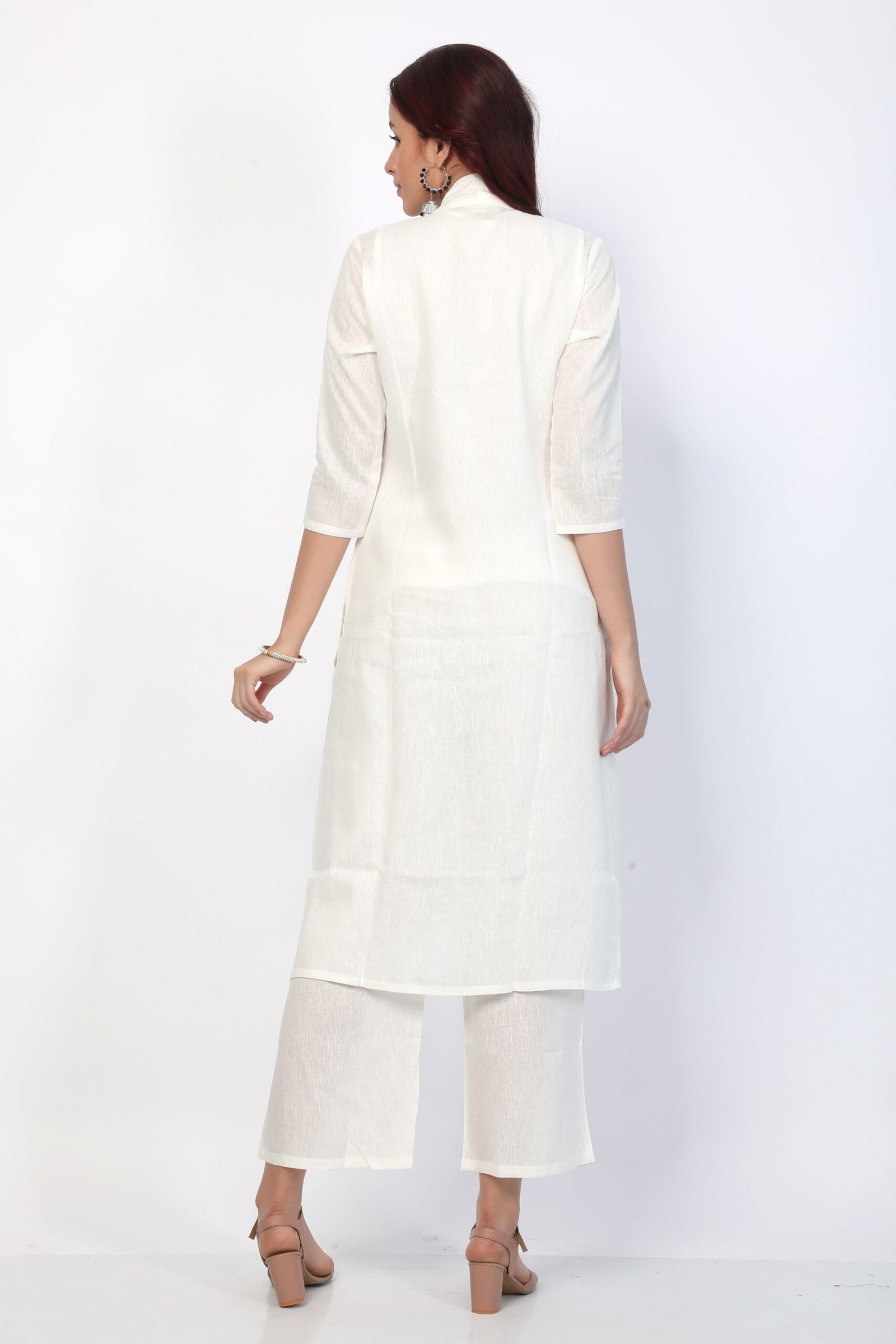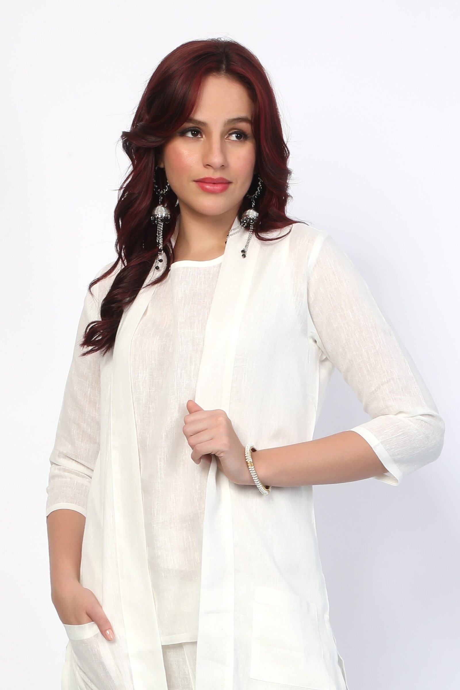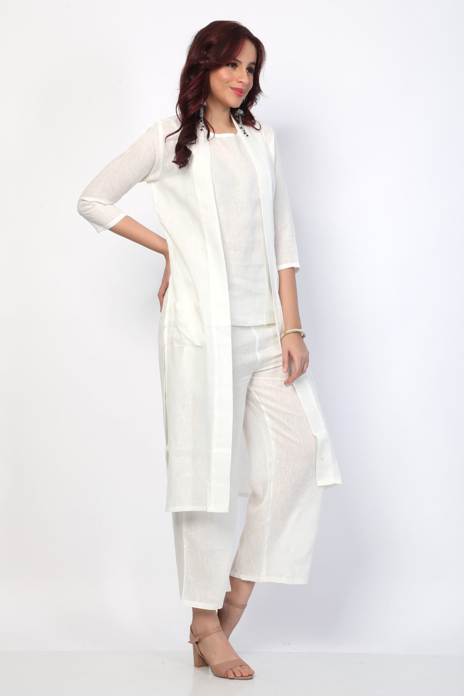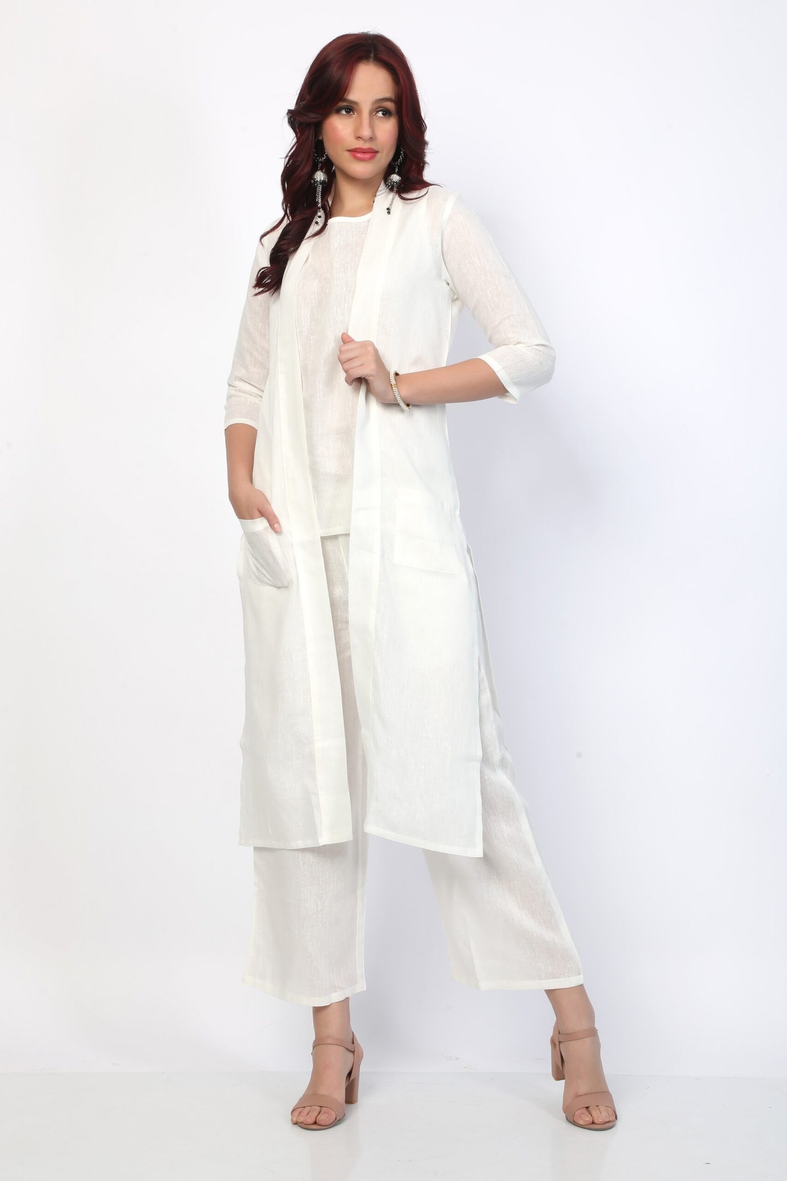 Jacket Details: Straight Hem, Knee Length, Open Front with Pockets & 3/4th Sleeves